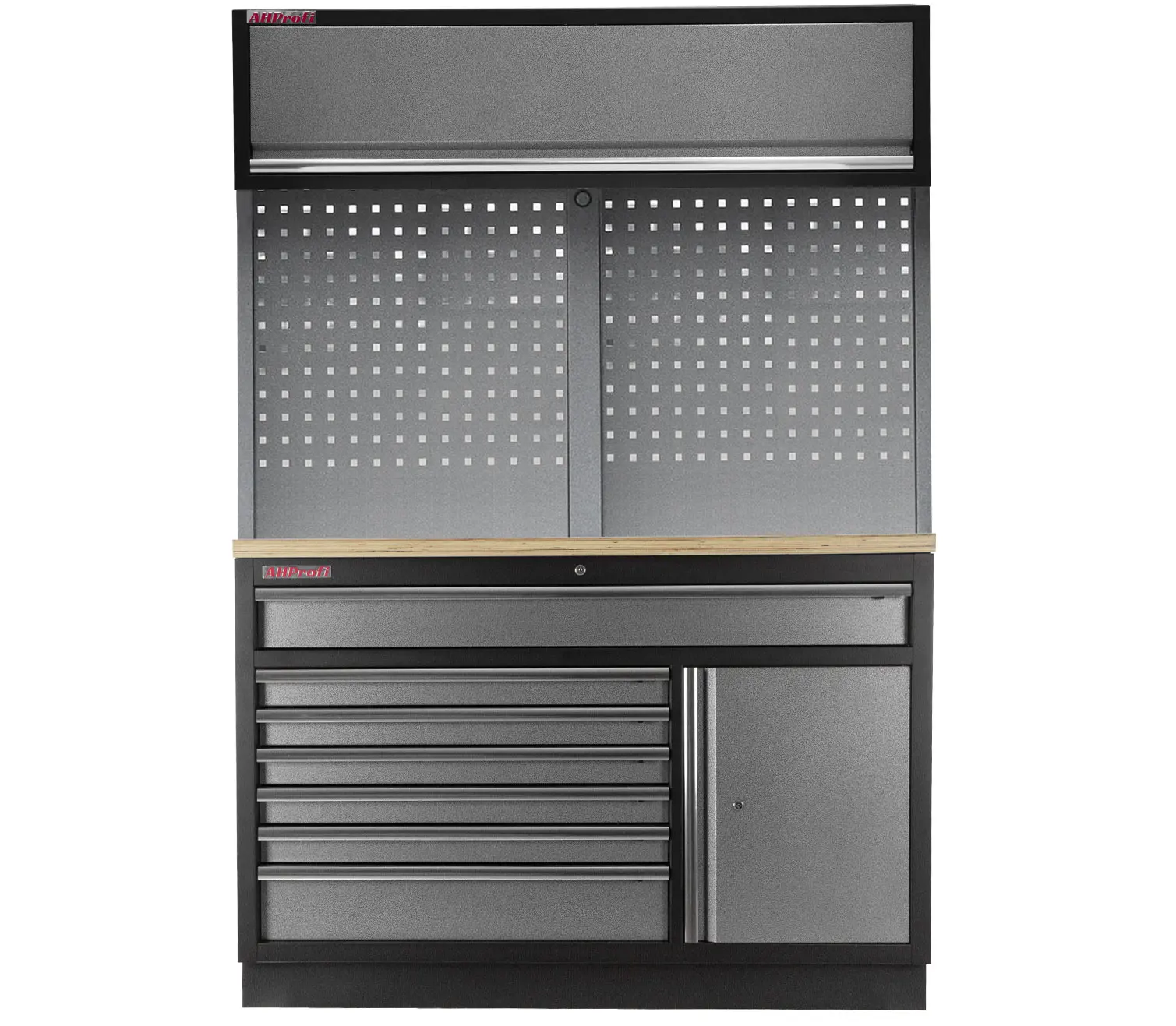 Spodná široká celokovová dielenská skrinka so 7 zásuvkami, skrinkou a drevenou pracovnou doskou.