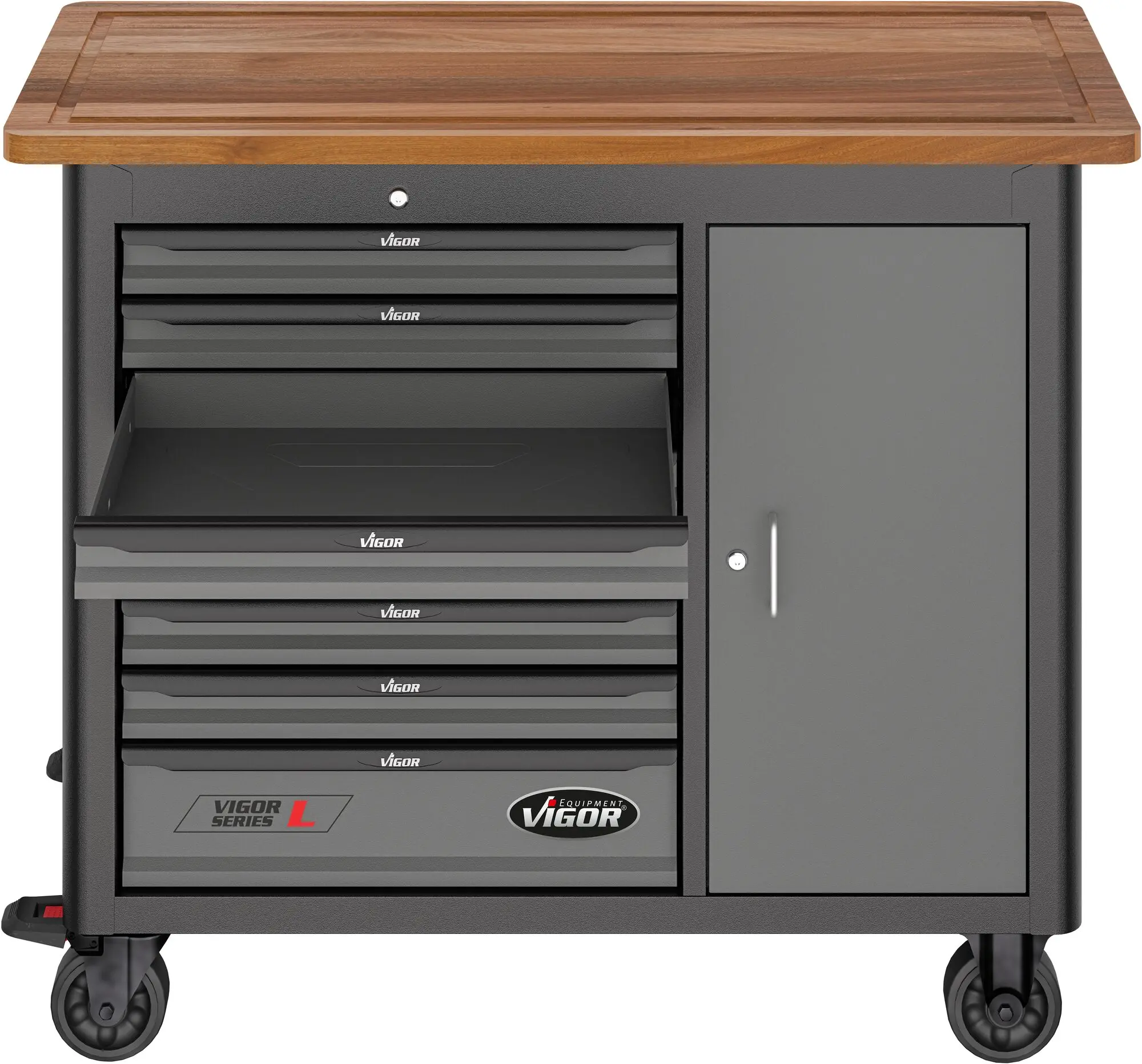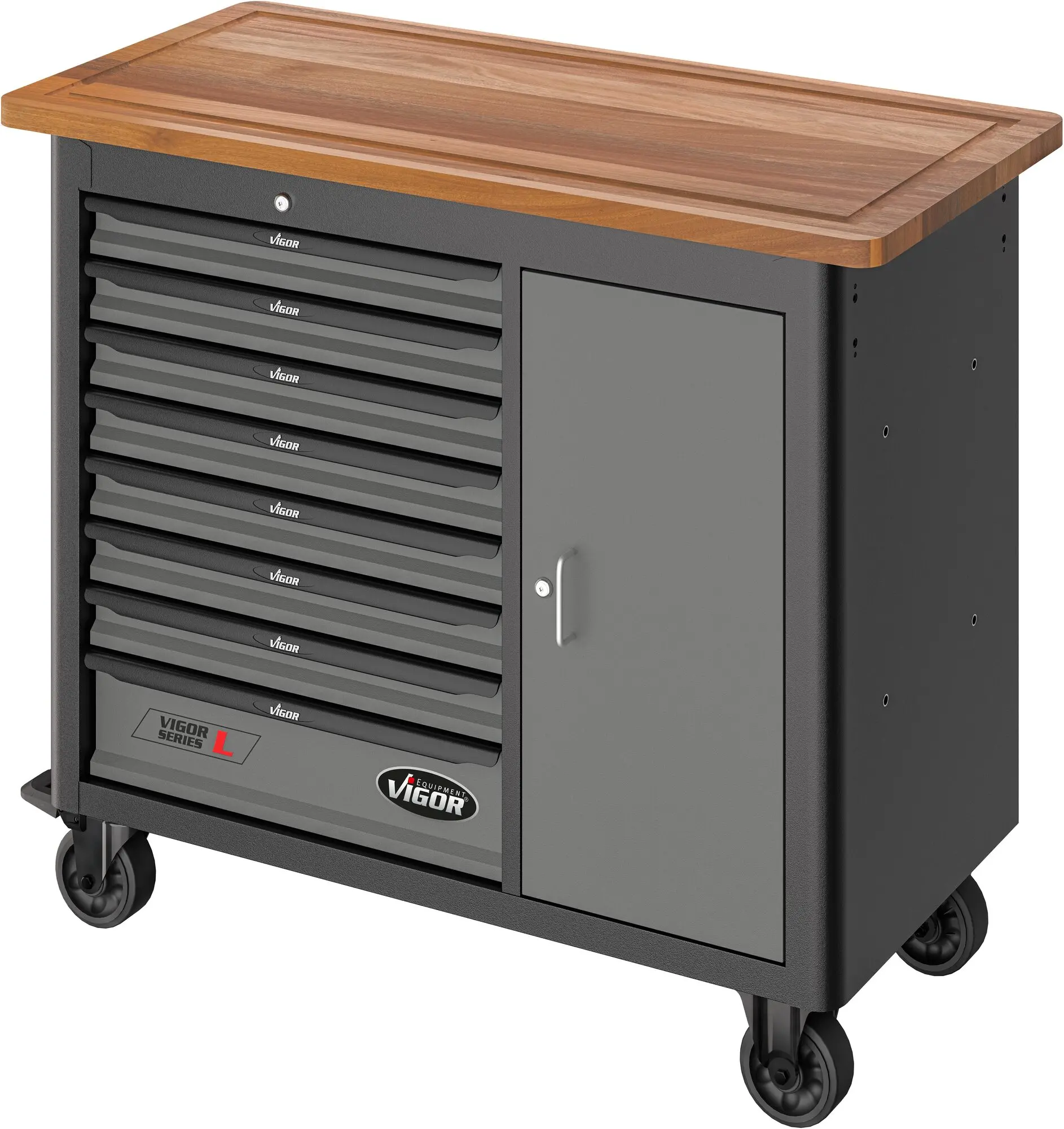 Dielenský pracovný stôl s drevenou pracovnou doskou a s náradím 375 ks. 8 zásuviek a dvierka.