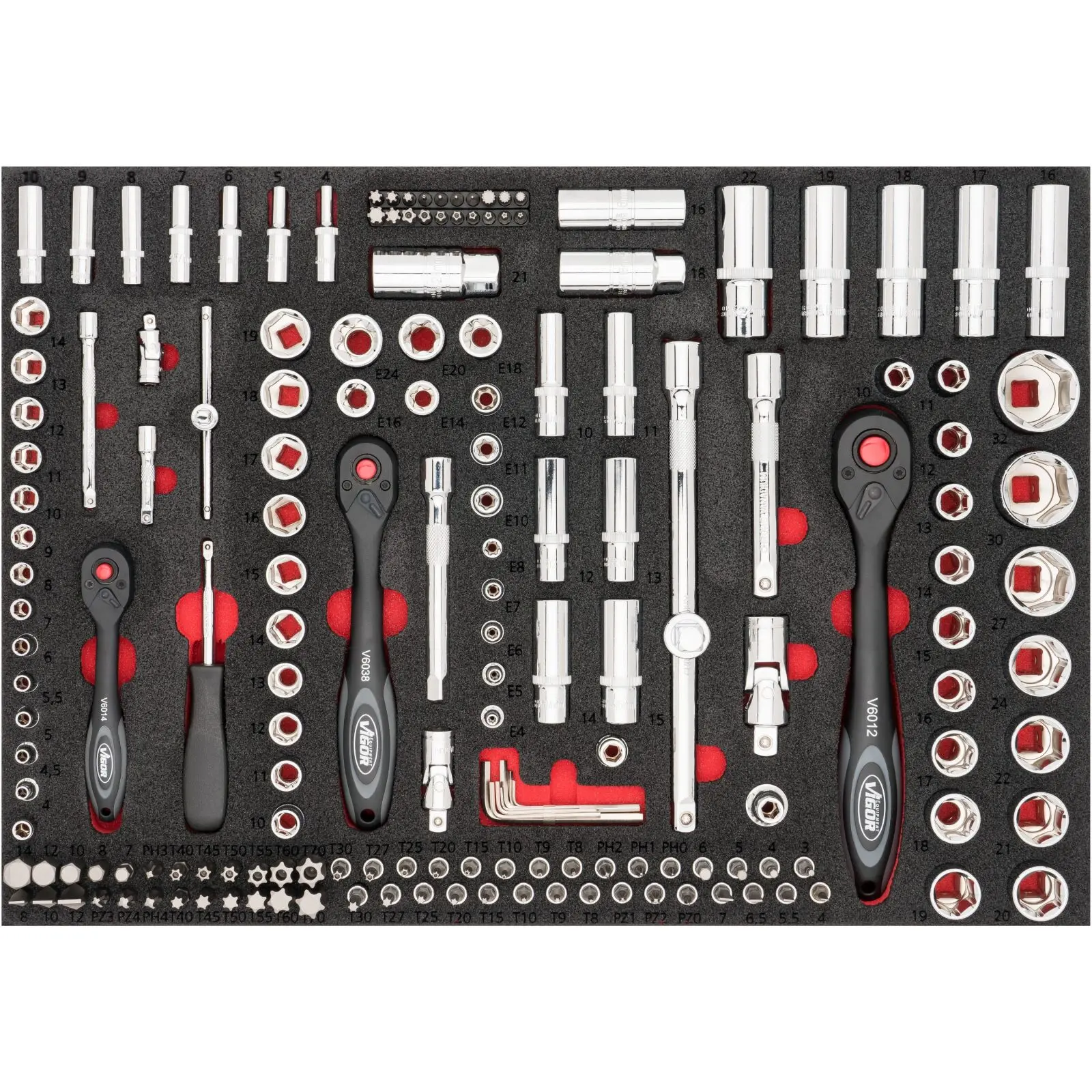 V 8 zásuvkách sú penové výplne dielenských vozíkov s bežne používaným náradím v profesionálnej kvalite. V sadách náradia nájdete golu 1/4 ", 1/2", 3/8 ", nástrčkové kľúče, sadu klieští, kladivo a paličku, veľkú sadu skrutkovačov (klasické, elektrikárske i hodinárske), imbus, veľkú sadu kľúčov a mnoho ďalšieho.