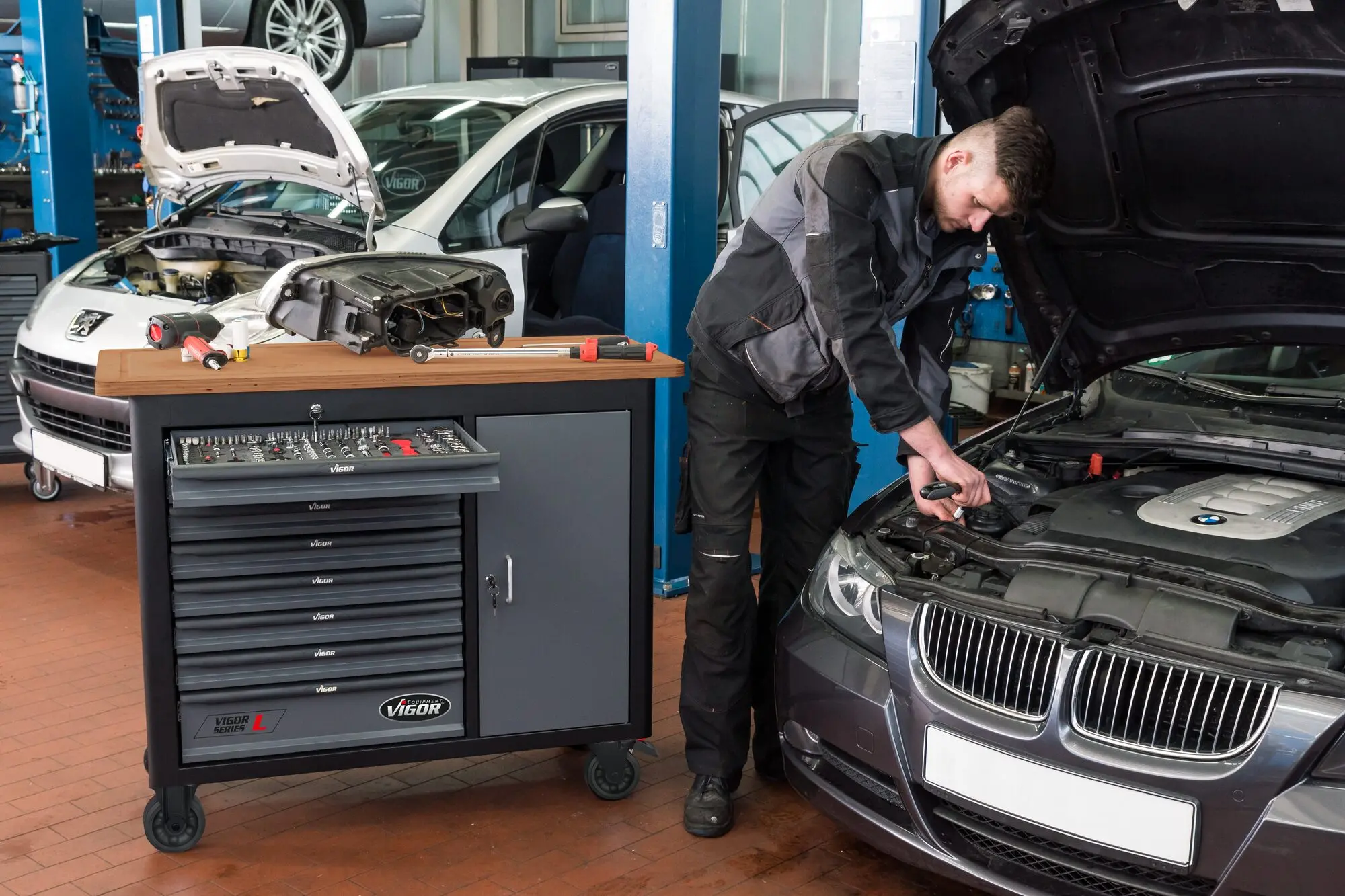 PROFI Dielenský vozík s 8 uzamykateľnými zásuvkami a úložným priestorom s dvierkami. Zostava je vybavená 375 kusmi profesionálneho náradia vhodného do PROFI dielní.