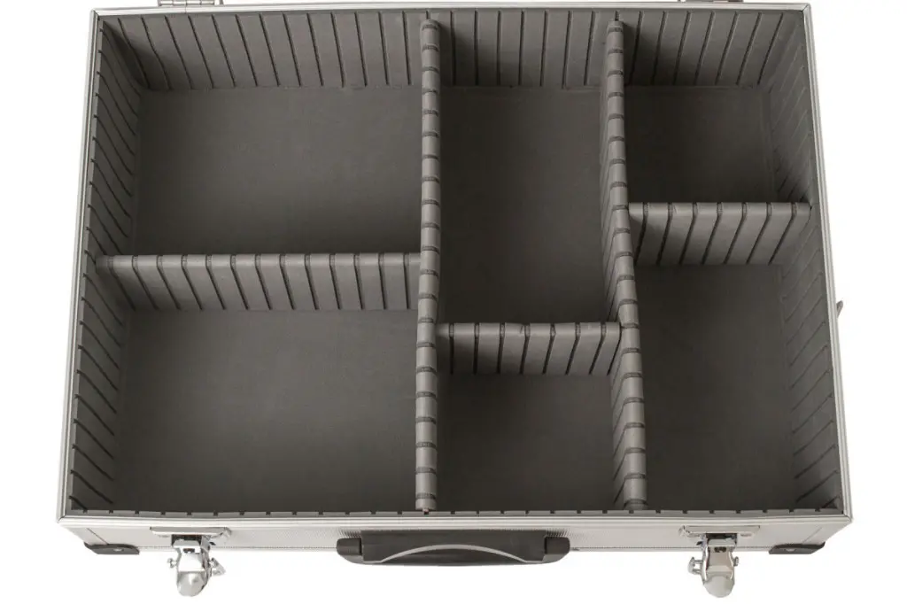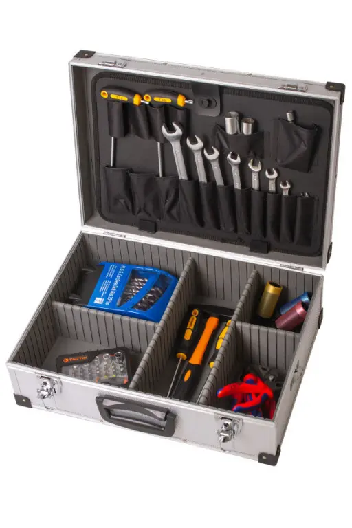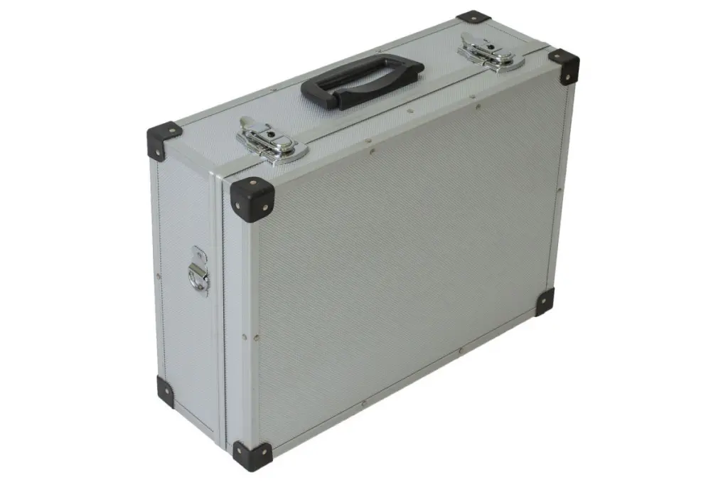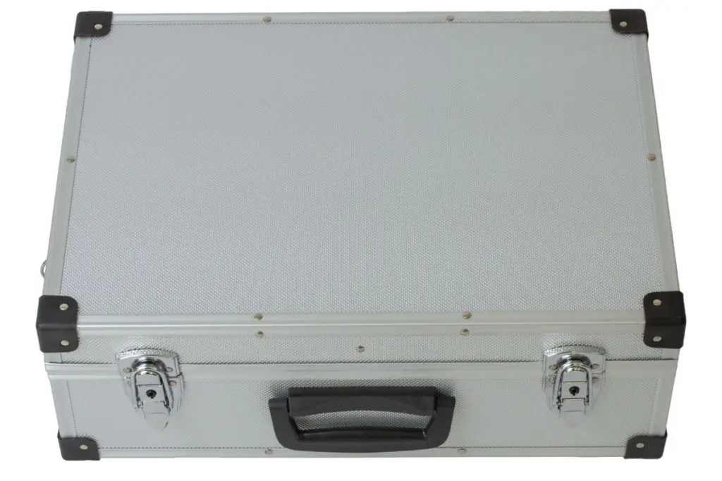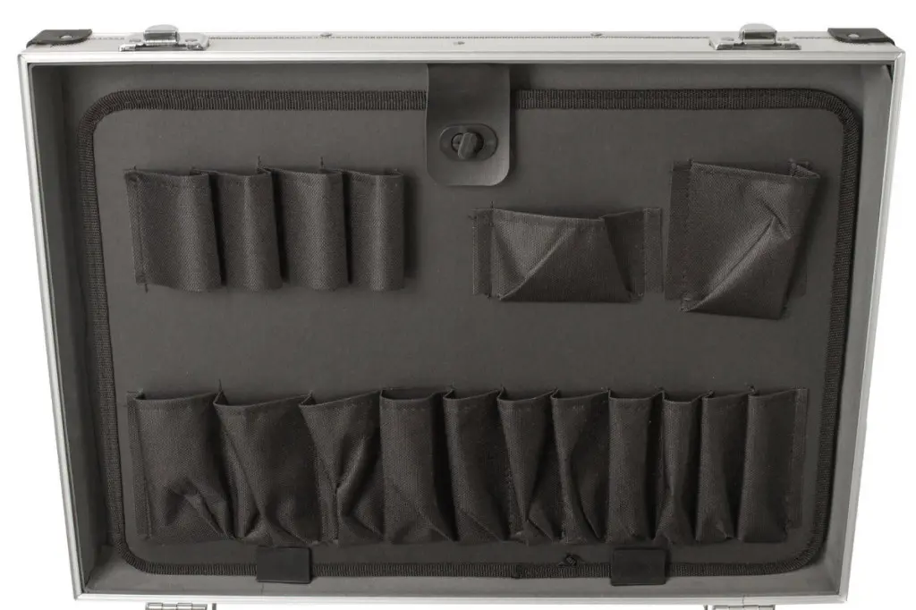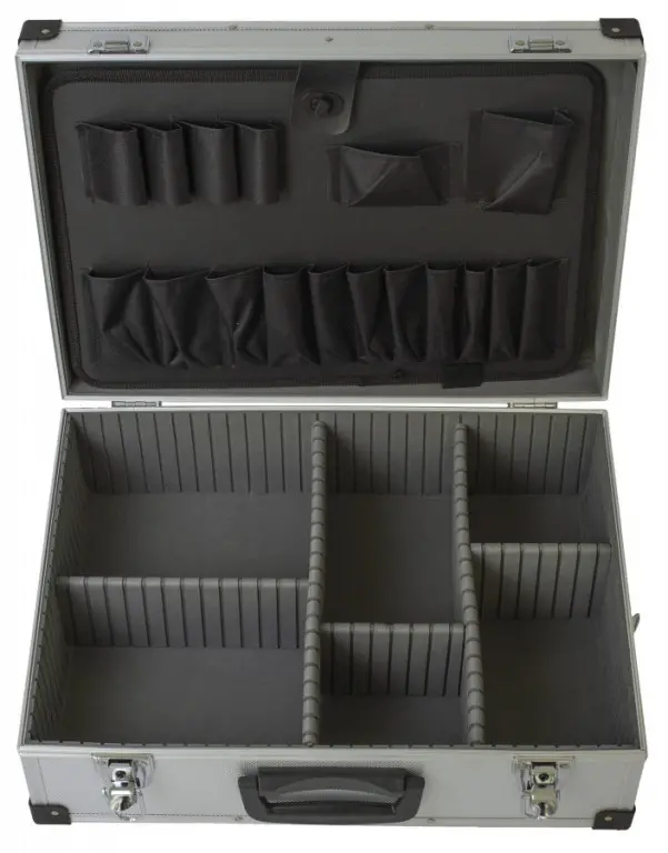 Hliníkový kufor na náradie o rozmeroch (š x h x v): 460 x 330 x 150 mm. Kufor je ľahko prenosný vďaka madlu, alebo prídavnému popruhu na ramená.