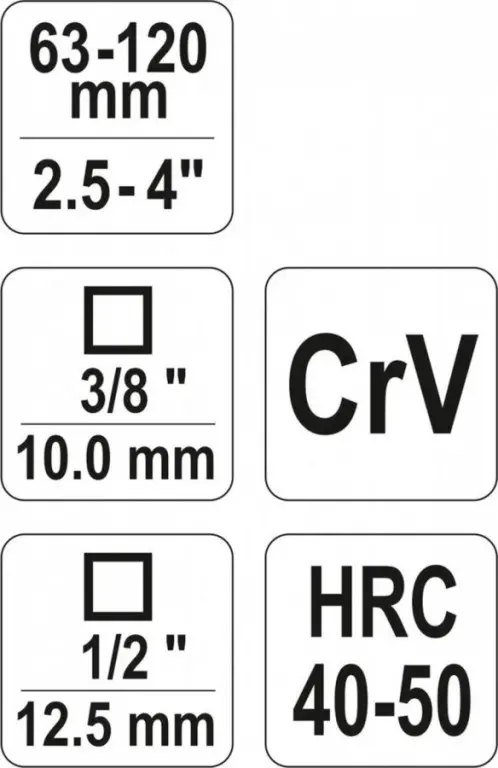 Klíč je zhotoven z CrV oceli s pevností 40-50 HRC. Pro povolování a utahování se využije zakončení 1/2", nebo 3/8".
