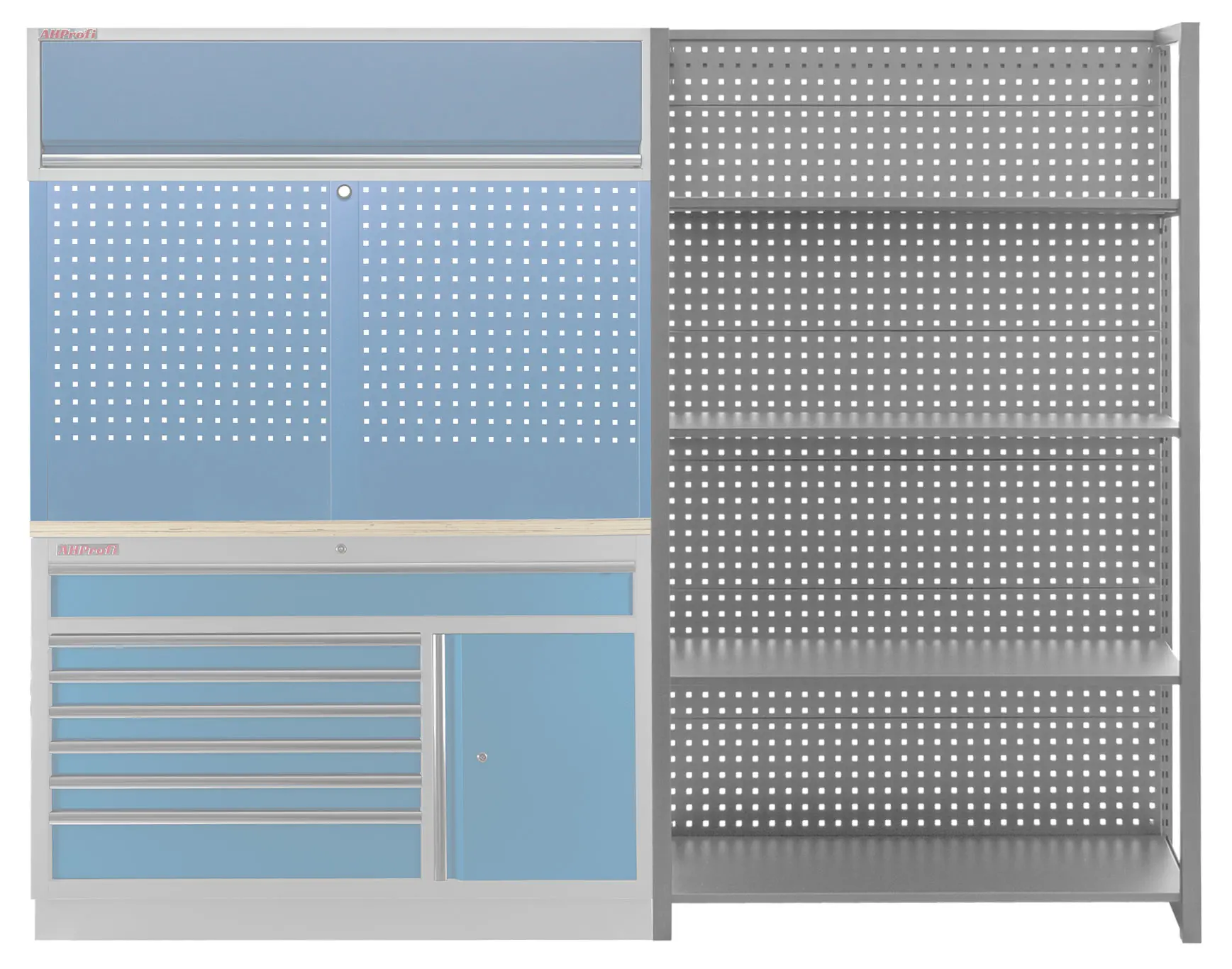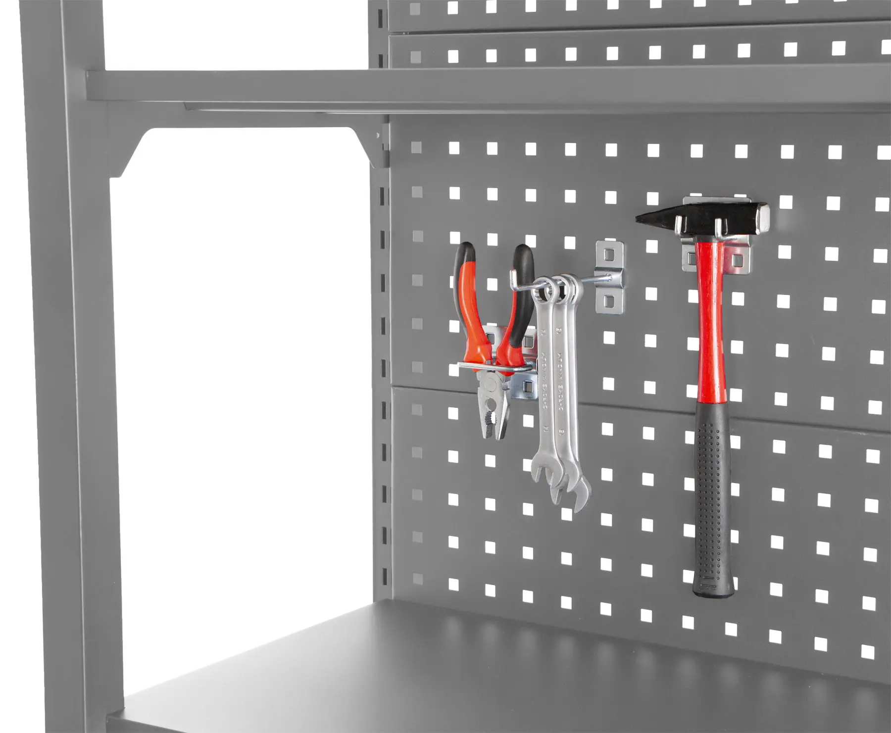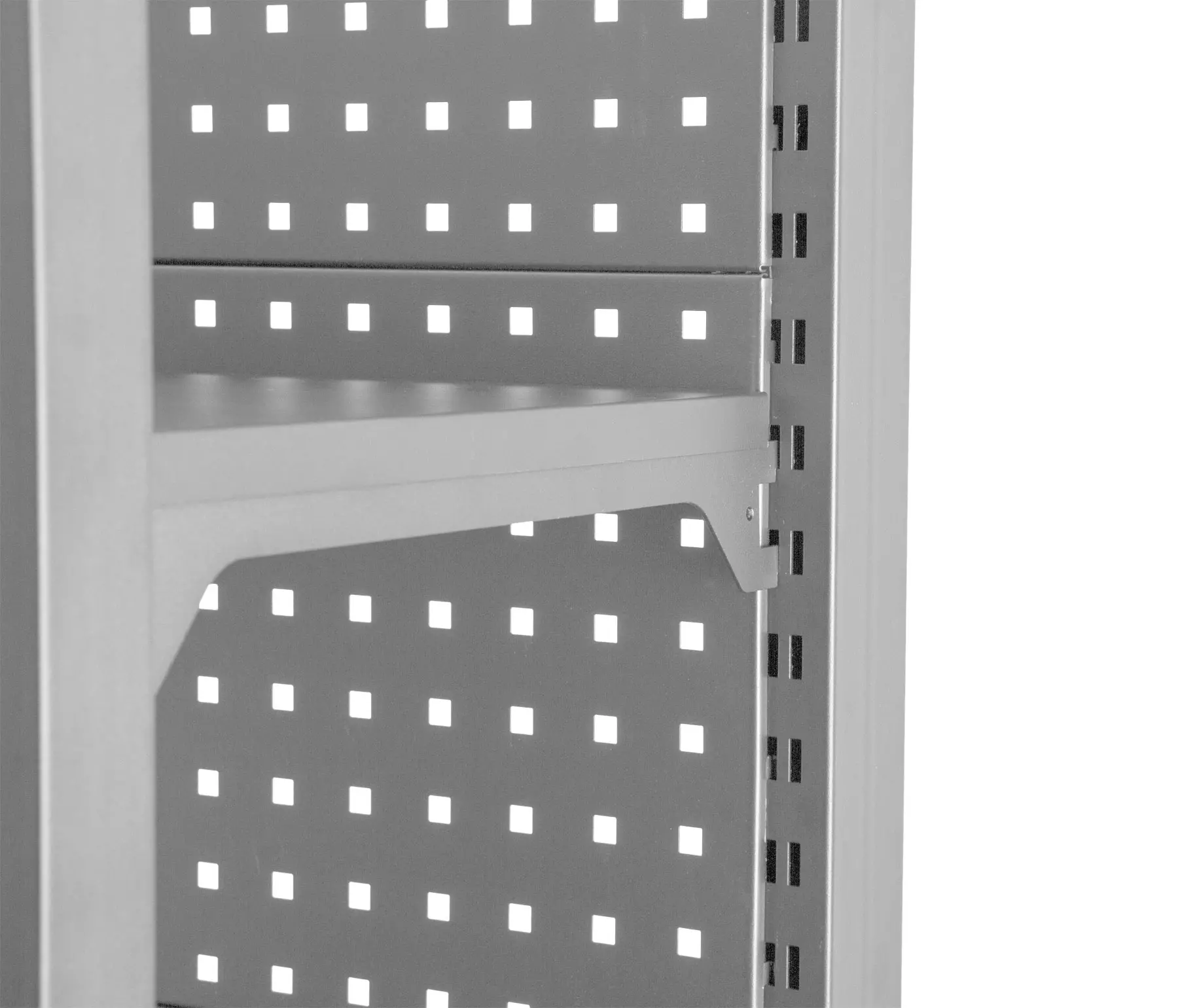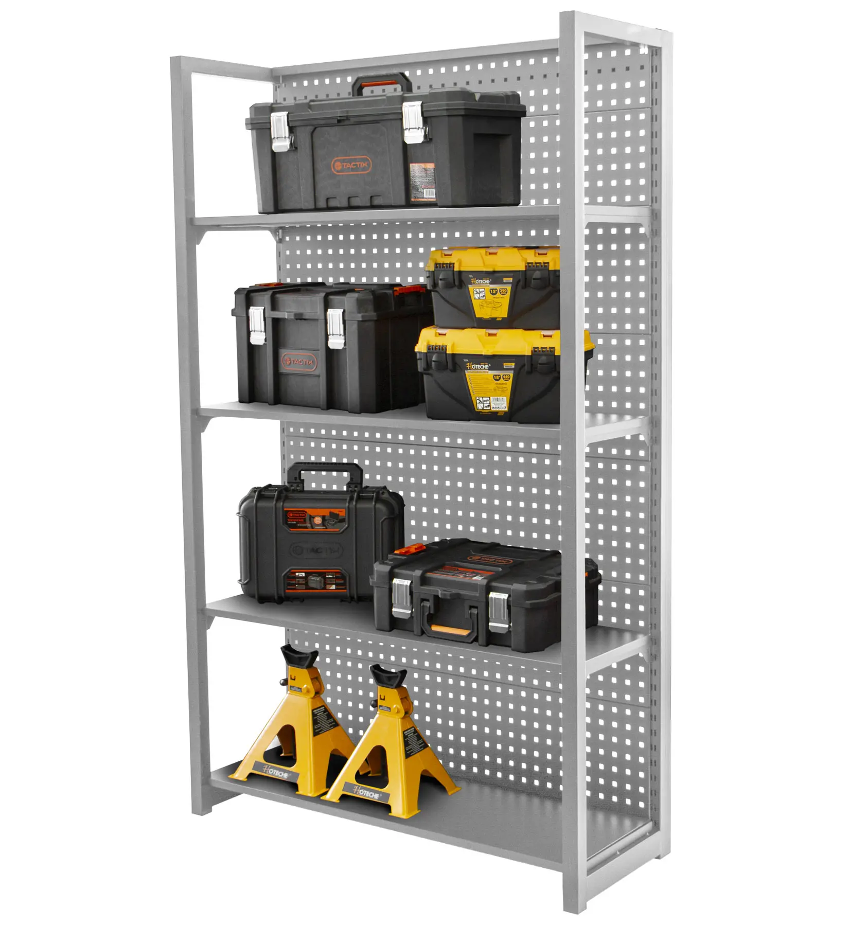 Stabilitu regálu zaisťujú dve bočnice a zadná dierovaná doska, ktorú je možné tiež využiť pre zavesenie drobného náraia pomocou háčikov (háčiky niesú súčasťou balenia).