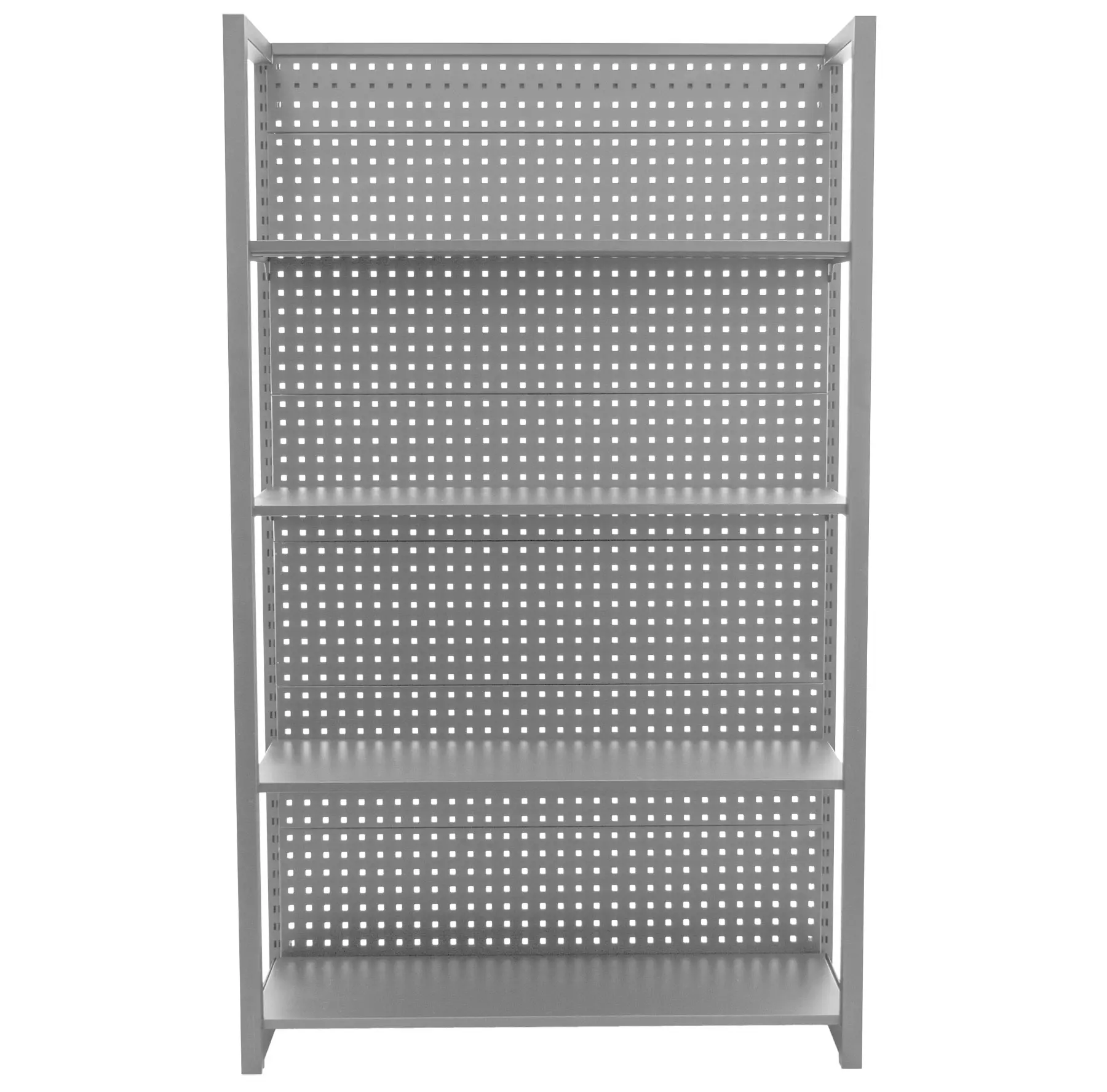 Policový regál so zadnou dierovanou doskou, 4 police, rozmery 1200 x 458 x 2000 mm.