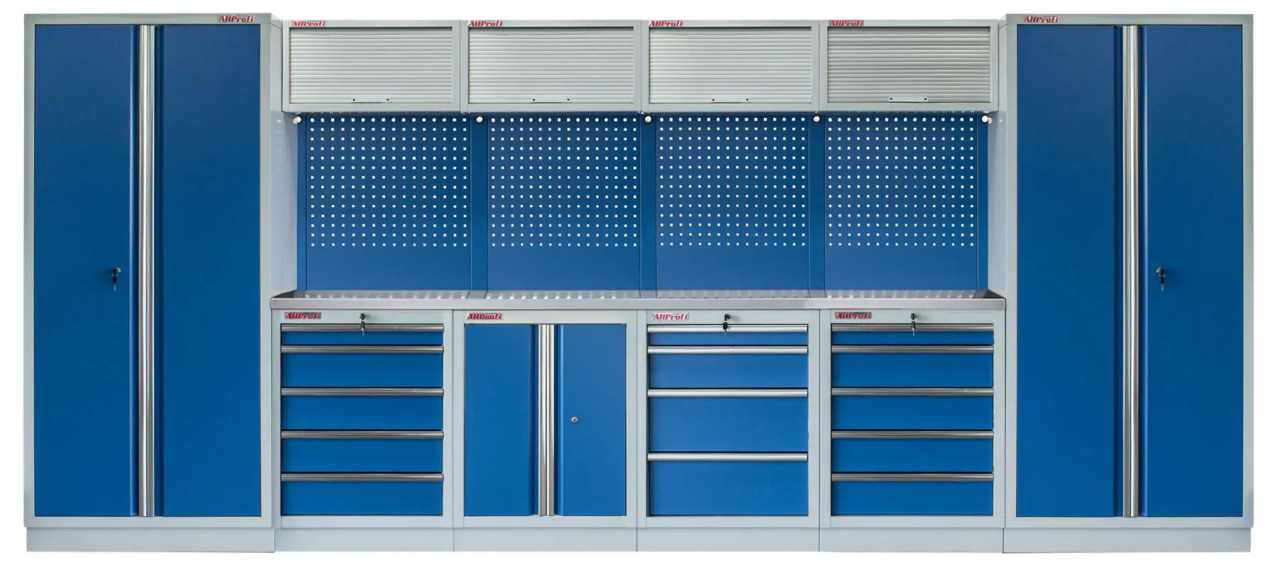 Dielenský nábytok PROFI BLUE s nerezovou doskou zaujme moderným a profesionálnym vzhľadom. Kombinácia modrej RAL 5023 a šedej RAL 7035 sa bude vynímať v každej garáži aj dielni. Zostava nábytku v sebe skrýva dostatočné množstvo úložného priestoru pre vaše náradie, autotechniku aj dielenské vybavenie. V kombinácii s robustnou pracovnou doskou získate multifunkčnú stenu, s ktorou vám práca pôjde od ruky vo všetkých smeroch. Jednotlivé komponenty sú plne konfigurovateľné, zostavu je možné podľa vašich potrieb rozšíriť o ďalšie skrine, regály aj pracovné stoly.Zostava nábytku MTGS1300AO