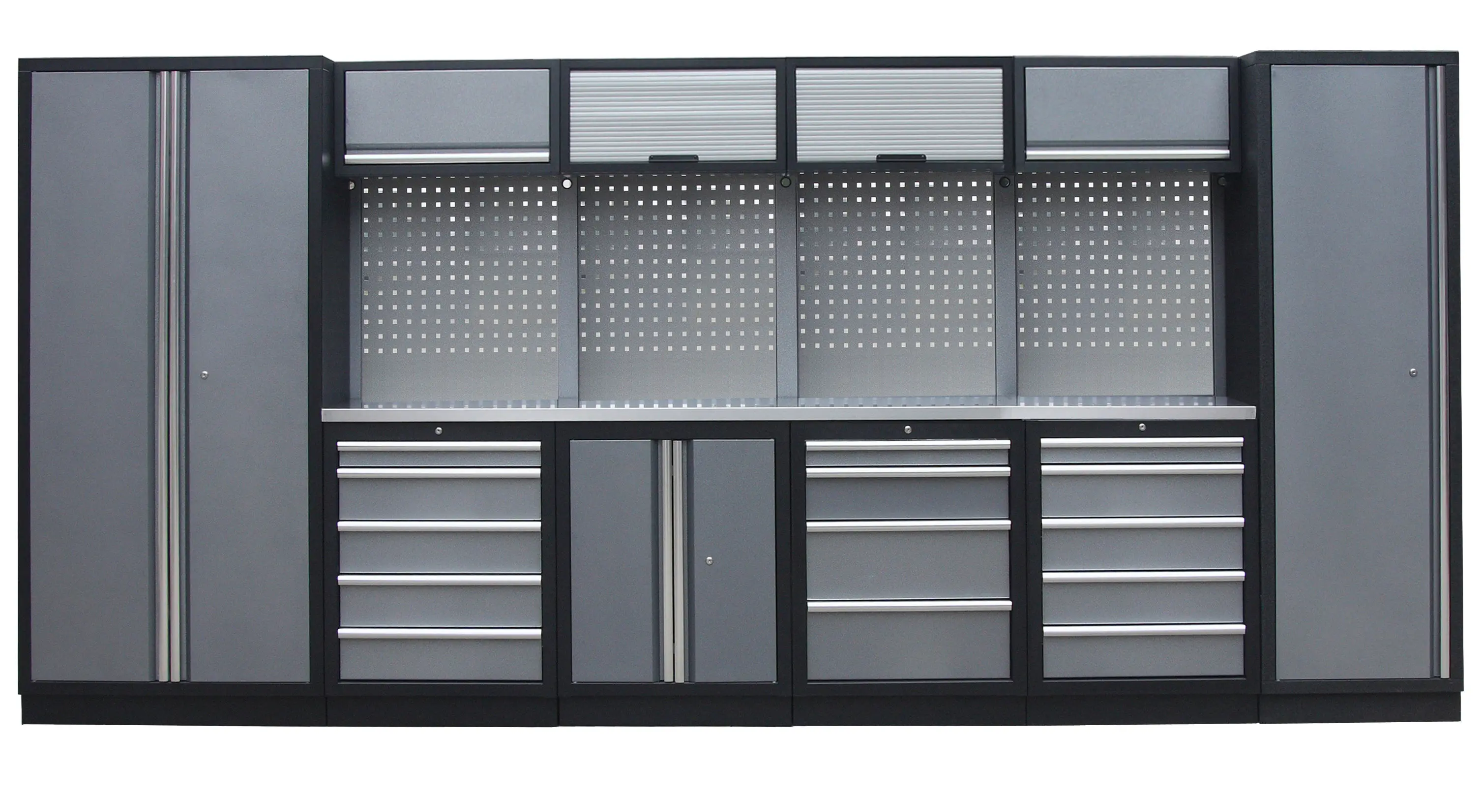 Dielenský nábytok PROFI GREY s nerezovou doskou zaujme moderným a profesionálnym vzhľadom. Kombinácia kladívkovo sivej RAL 3031 a čiernej RAL 9004 sa bude vynímať v každej garáži aj dielni. Zostava nábytku v sebe skrýva dostatočné množstvo úložného priestoru pre vaše náradie, autotechniku aj dielenské vybavenie. V kombinácii s robustnou pracovnou doskou získate multifunkčnú stenu, s ktorou vám pôjde práca od ruky vo všetkých smeroch. Jednotlivé komponenty sú plne konfigurovateľné, zostavu je možné podľa vašich potrieb rozšíriť o ďalšie skrine, regály aj ponk.Zostava nábytku TGS1300AC