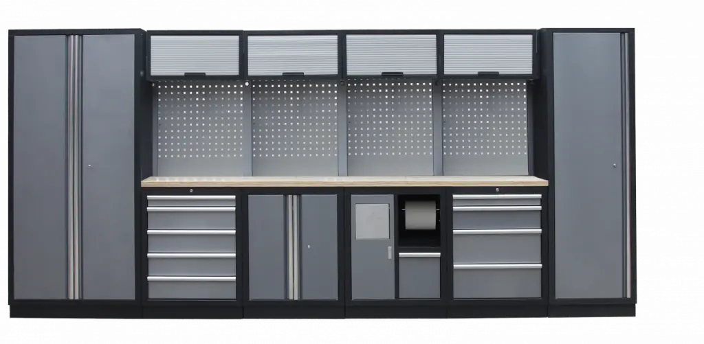 Zostava 21 ks dielenského nábytku PROFI GREY s drevenou pracovnou doskou