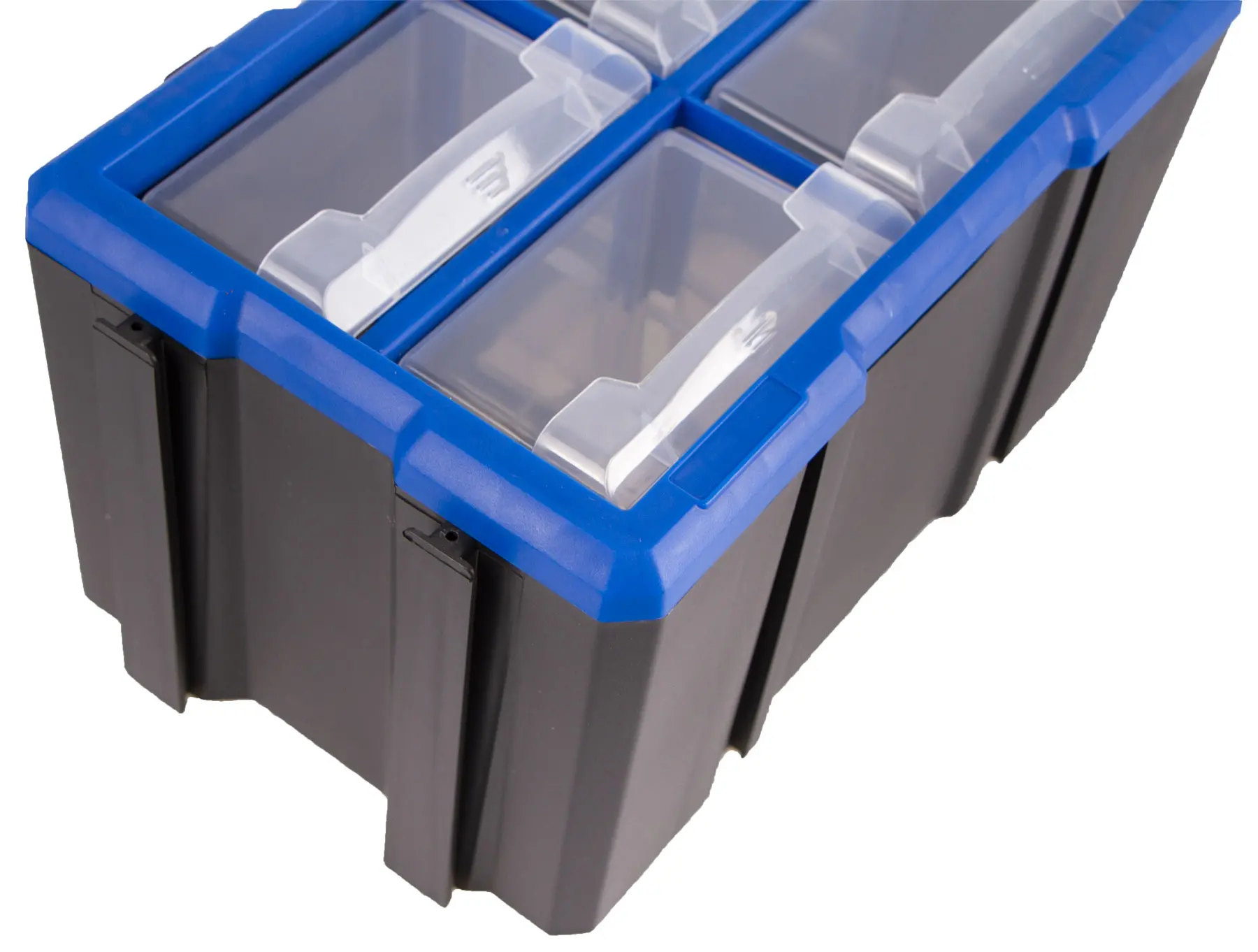 Organizér so štyrmi veľkými plastovými boxami. Rozmery 29,5x19,5x16 cm.