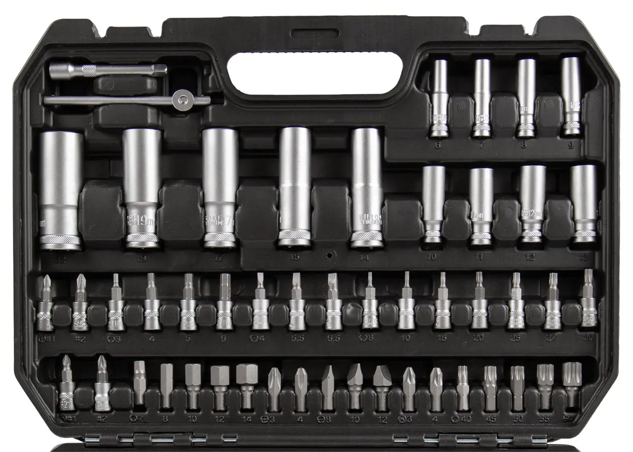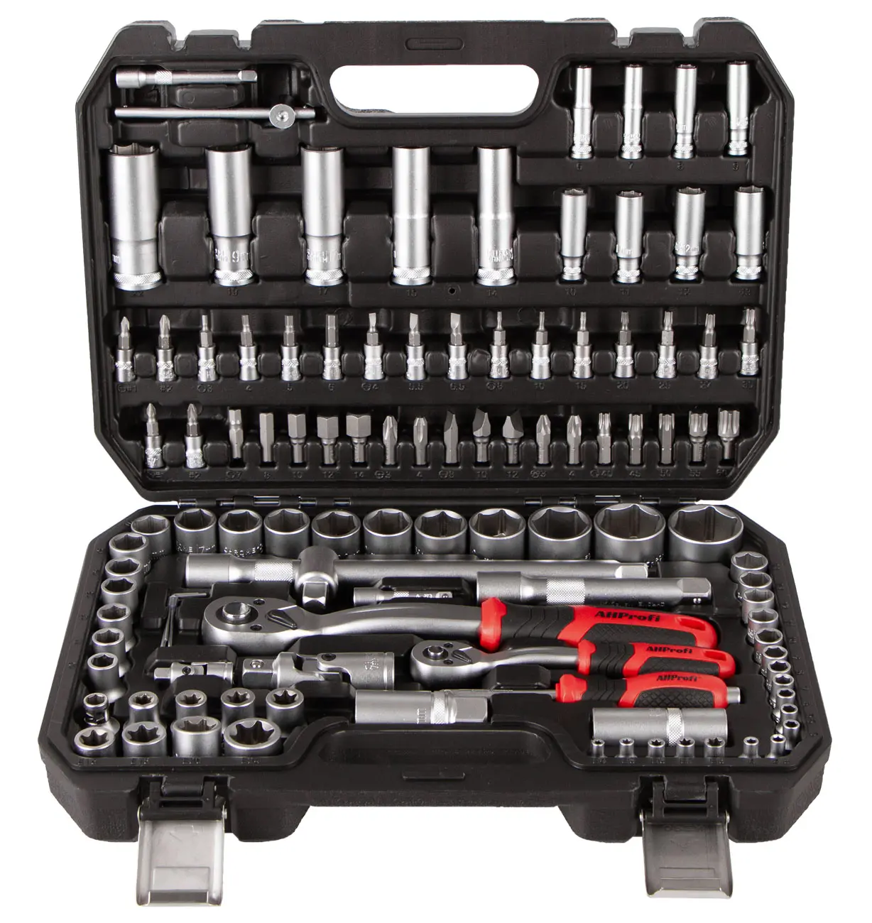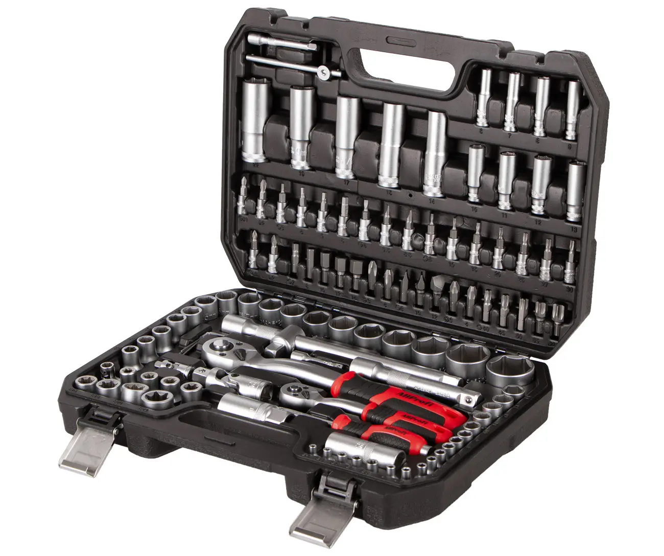 Gola sada 1/2" a 1/4" obsahuje 108 kusov náradia, ako račne, šesťhranné nástrčné kľúče, nástrčné kľúče E-Torx, kľúče na sviečky, bity a ďalšie. Celá sada je prehľadne uložená v pevnom plastovom kufríku o rozmere 385 x 280 x 85 mm.