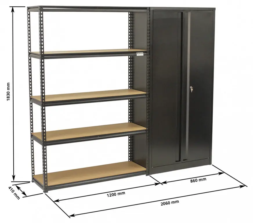 Regálový systém obsahuje klasický rovný regál so šírkou 1200 mm a uzamykateľnou dielenskou skriňou so šírkou 860 mm.