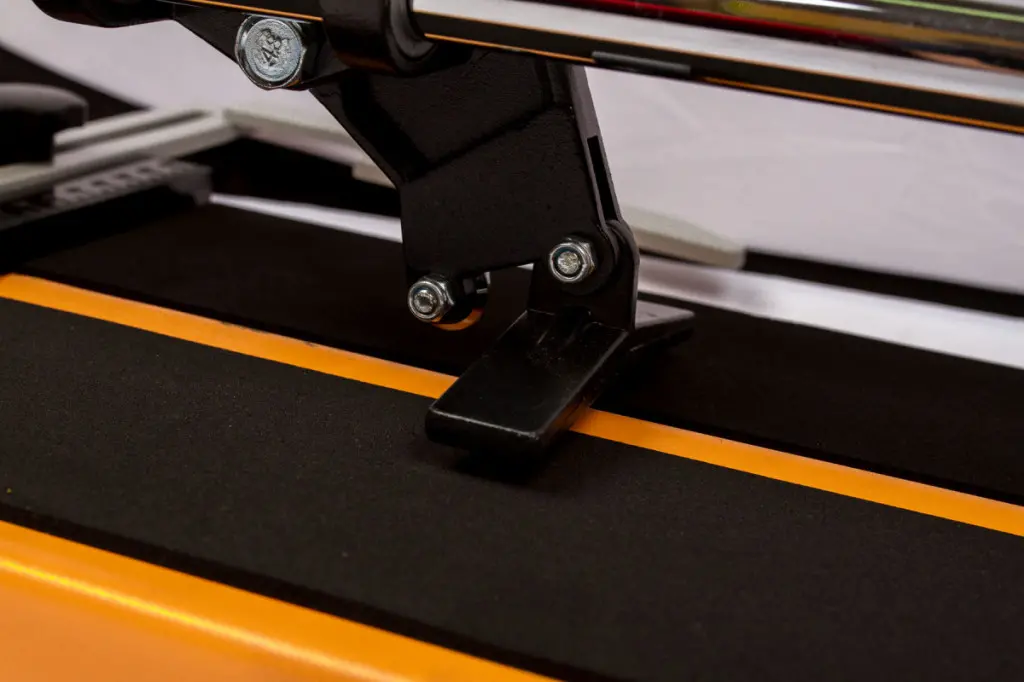Dosadacia plocha je ošetrená molitanom, ktorý zabraňuje posunutiu dlaždice pri rezaní a zabraňuje tak možnému poškrabaniu, alebo nepresnému prevedeniu rezu. Dvojitá oceľová koľajnica je zárukov stability pre prevedenie presného a rovného rezu. Posuv reznej hlavy je zaistený štyrmi klznými plastovými ložiskami. Práca Vám uľahčí i zabudovaná plastová mierka.