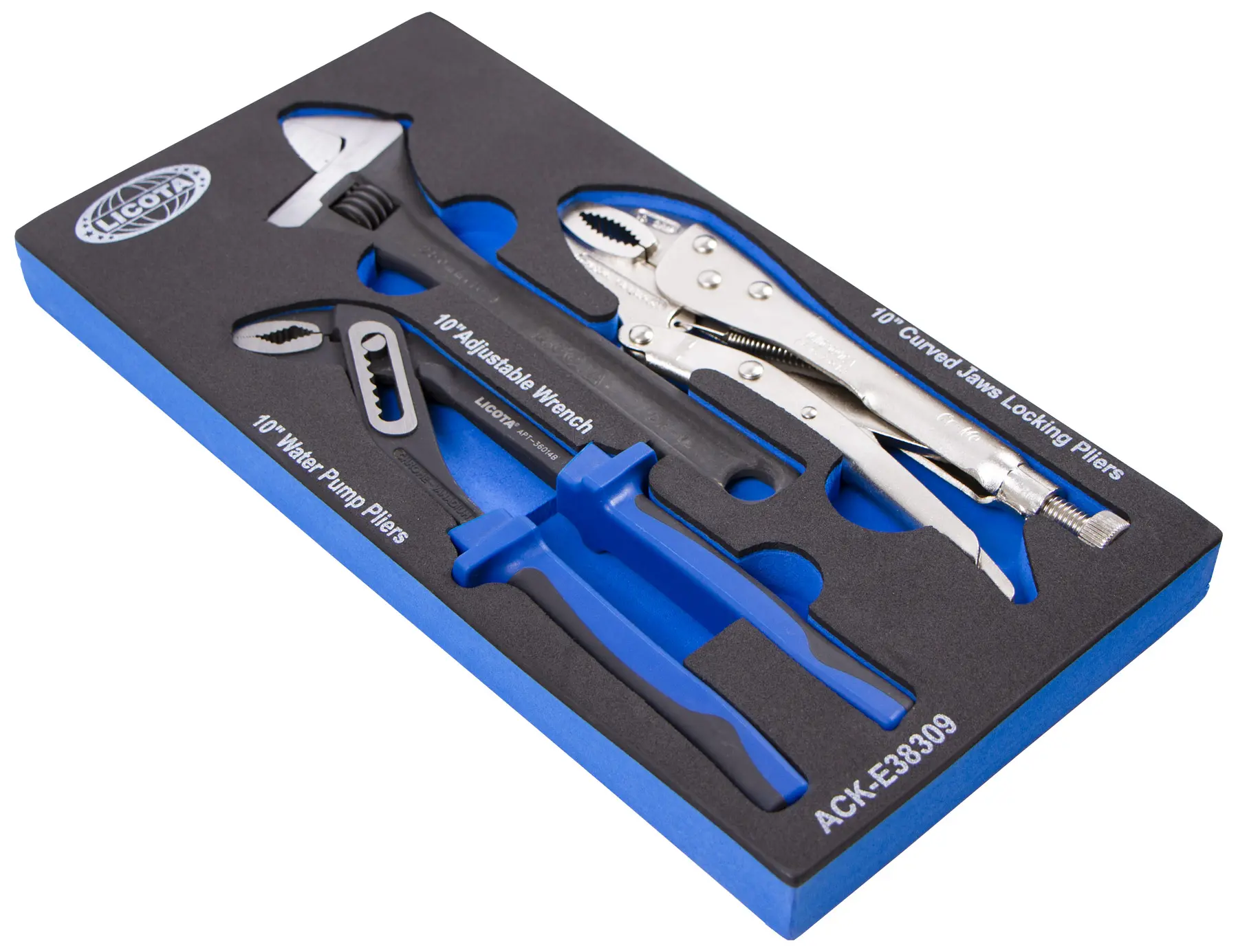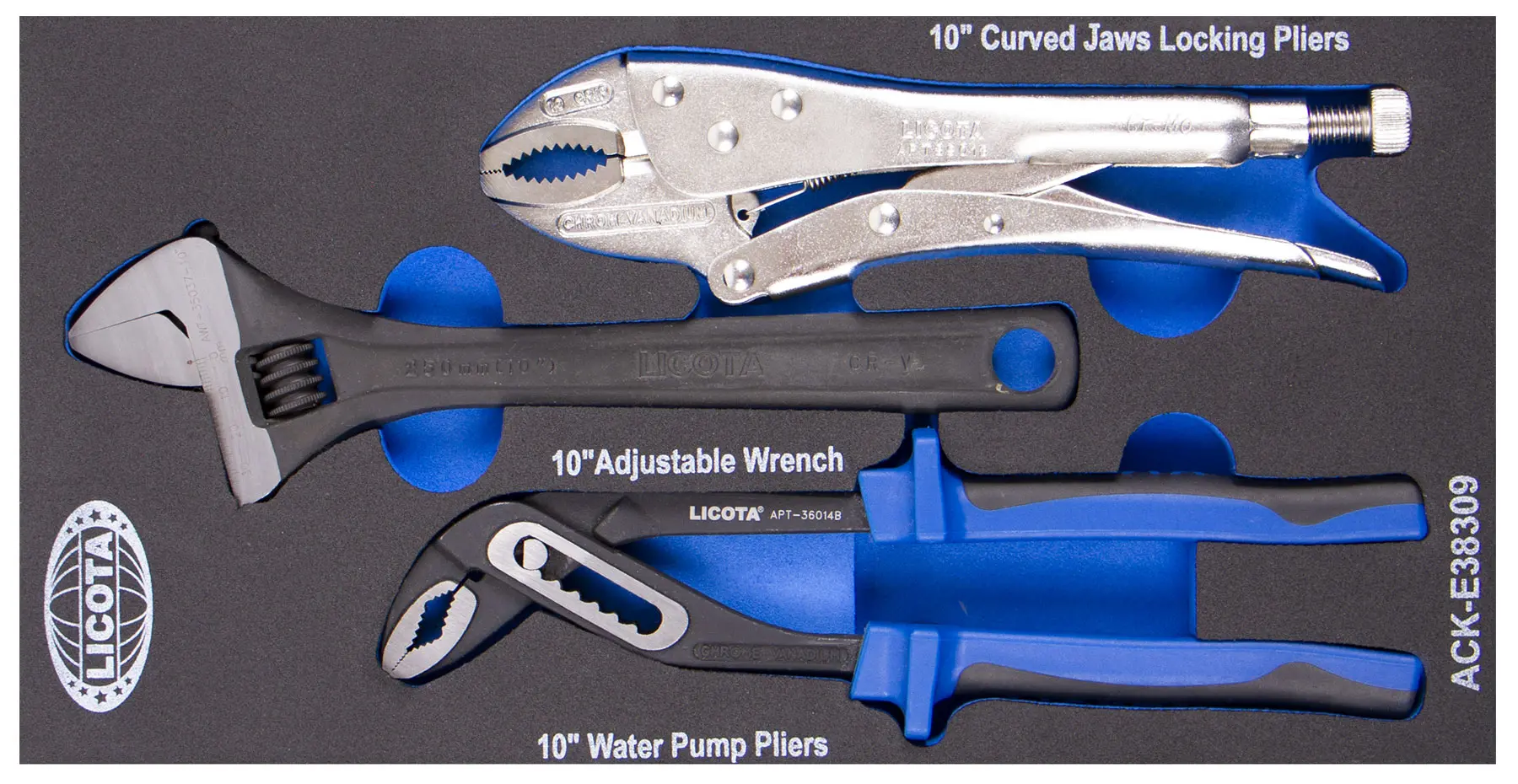Sada náradia v penovej výplni skriniek a vozíkov, značka LICOTA, obsahuje nastaviteľný kľúč, SIKO...