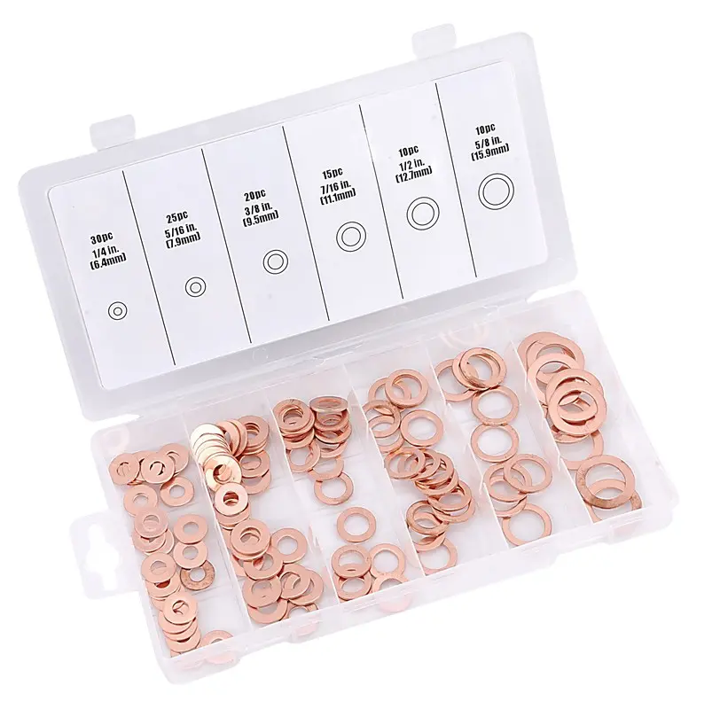 Medené podložky s veľkosťami 6,4; 7,9, 9,5; 11,1; 12,7 a 15,9 mm.