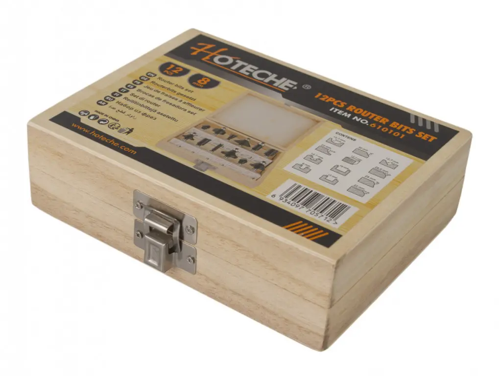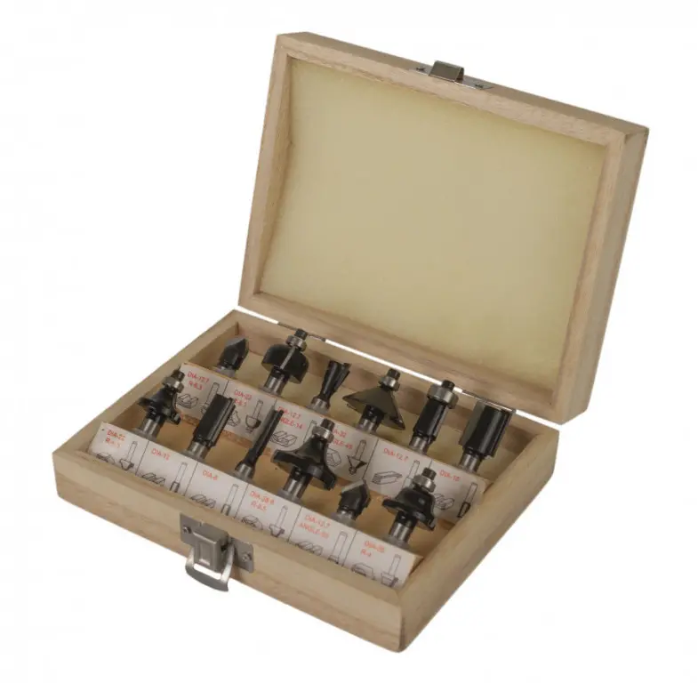Celá sada je prehľadne uskladnená v drevenej krabičke, kde má každá frézka svoje miesto a svoj popisok.