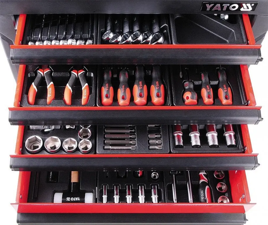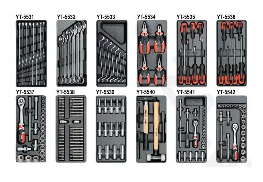V 6 zásuvkách sú penové výplne dielenských vozíkov s bežne používaným náradím v profesionálnej kvalite. V sadách náradia nájdete golu 1/4 ", 1/2", 3/8 ", nástrčkové kľúče, sadu klieští, kladivo a paličku, veľkú sadu skrutkovačov (klasické, elektrikárske i hodinárske), imbus, veľkú sadu kombinovaných kľúčov a mnoho ďalšieho .