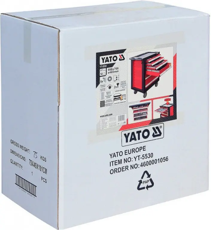 Pojazdná dielenská skrinka vybavená celkom 177 kusmi náradí YATO, 6 uzamykateľných zásuviek pre u...