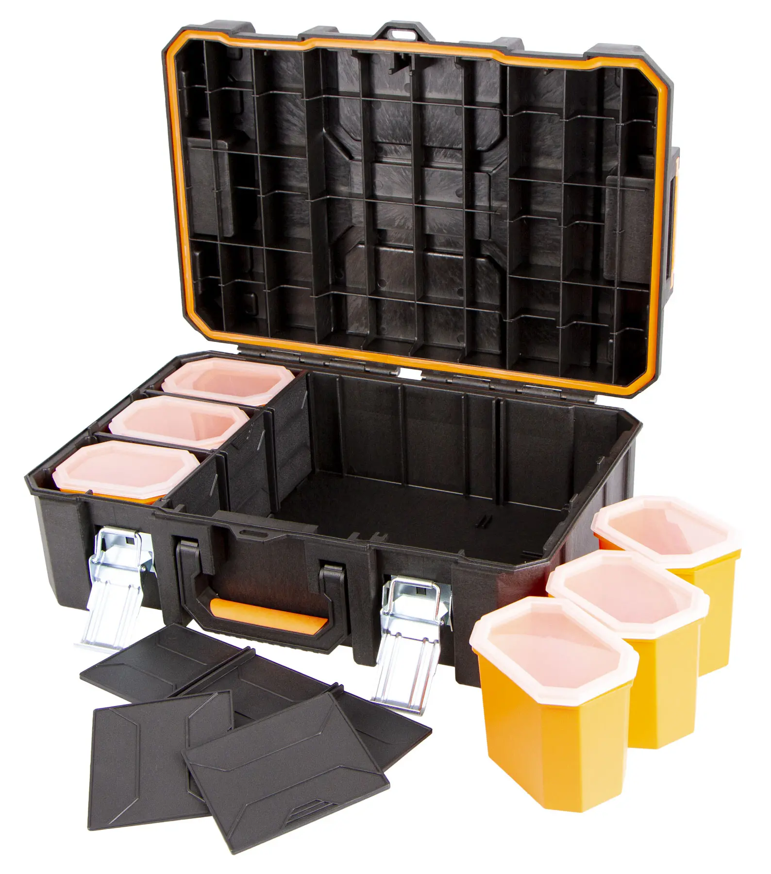 Odolný plastový kufor s vodotesným prevedením chráni obsah pred vlhkosťou, prachom a nečistotami. Je ideálny na bezpečné uloženie náradia a drobného materiálu.