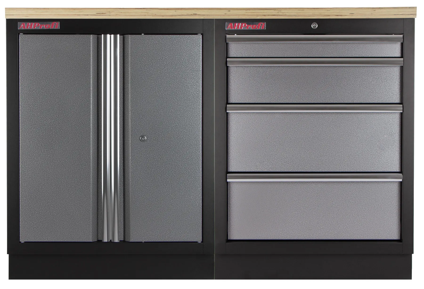 Dielenský nábytok PROFI GREY s drevenou doskou zaujme moderným a profesionálnym vzhľadom. Kombinácia kladívkovo sivej RAL 3031 a čiernej RAL 9004 sa bude vynímať v každej garáži aj dielni. Zostava nábytku v sebe skrýva dostatočné množstvo úložného priestoru pre vaše náradie, autotechniku aj dielenské vybavenie. V kombinácii s robustnou pracovnou doskou získate multifunkčnú stenu, s ktorou vám pôjde práca od ruky vo všetkých smeroch. Jednotlivé komponenty sú plne konfigurovateľné, zostavu je možné podľa vašich potrieb rozšíriť o ďalšie skrine, regály aj ponk.Zostava nábytku TGS1300BAL07