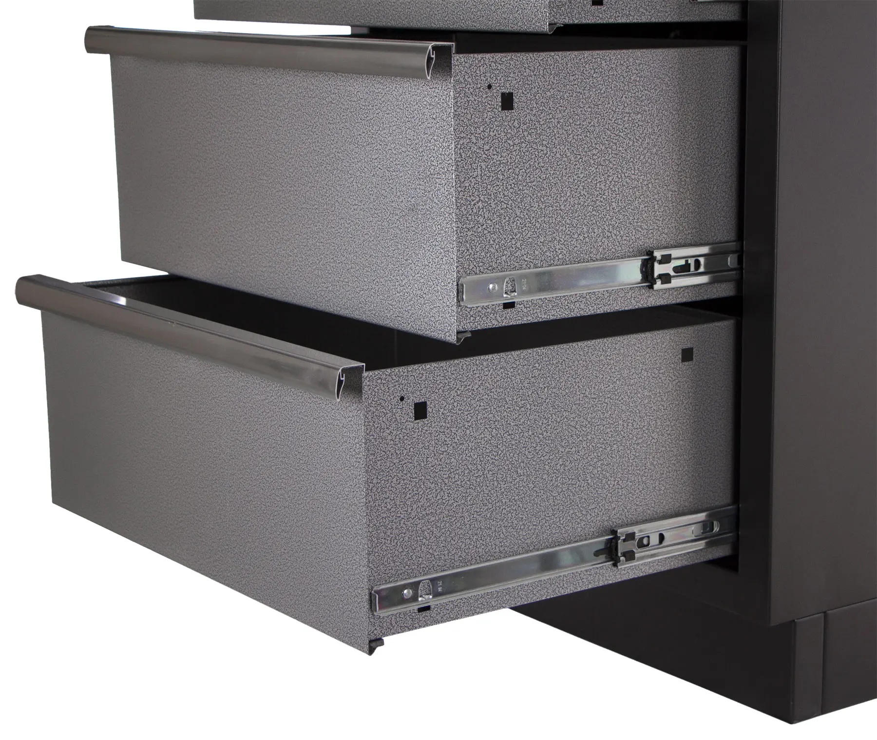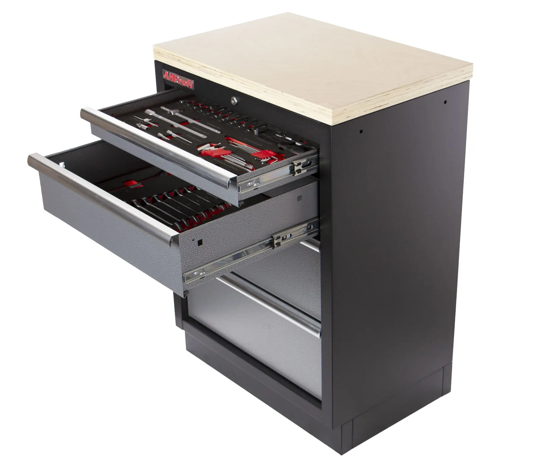 Rozmer zásuviek: 1x úzka zásuvka 570 x 400 x 70 mm, 1x stredná zásuvka 570 x 400 x 150 mm, 2x široká zásuvka 570 x 400 x 225 mm.