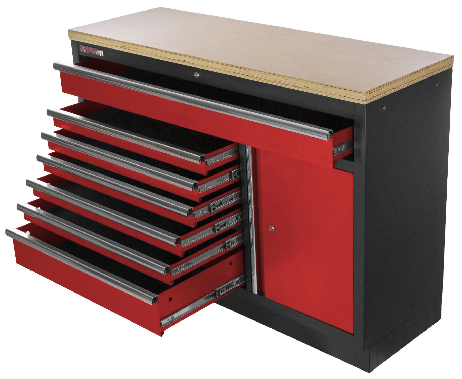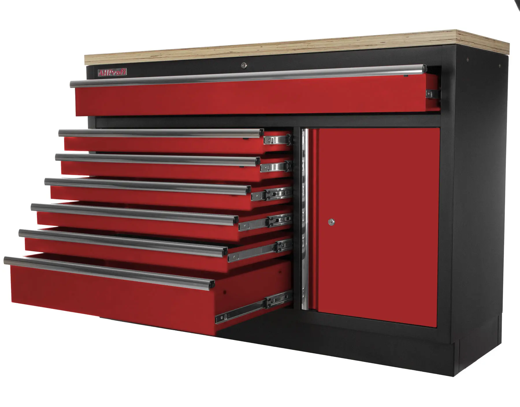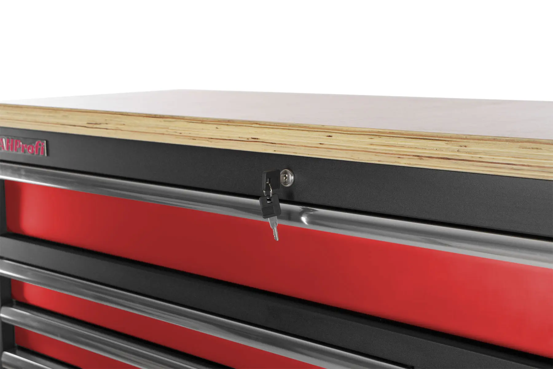 Široká celokovová dielenská skrinka so 7 zásuvkami, skrinkou a drevenou pracovnou doskou.