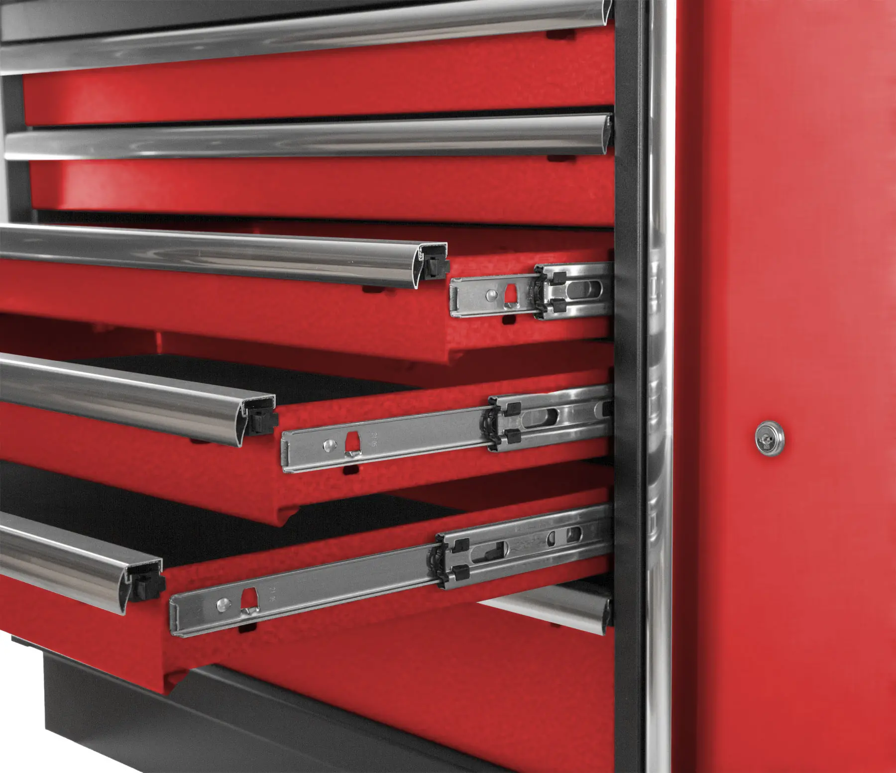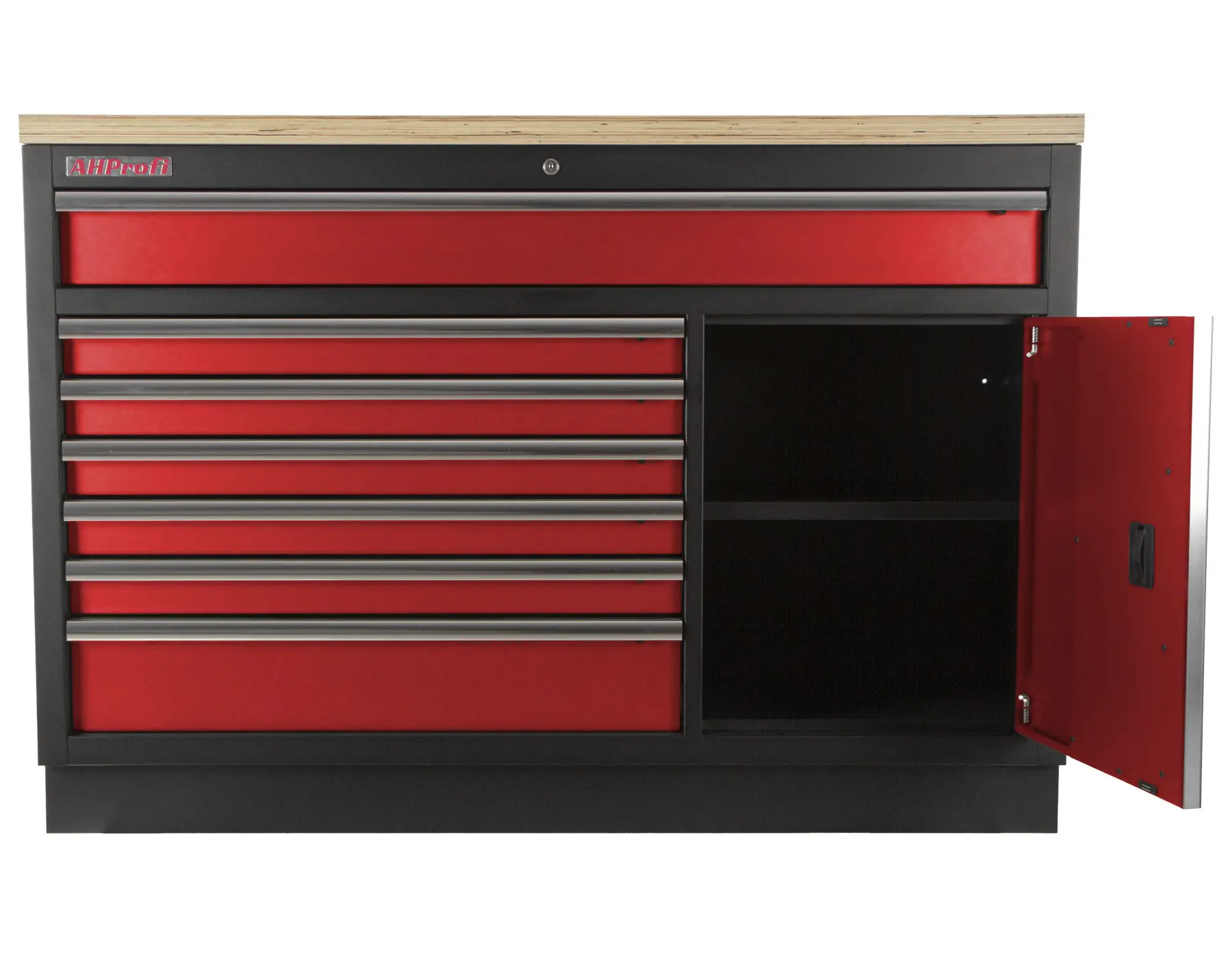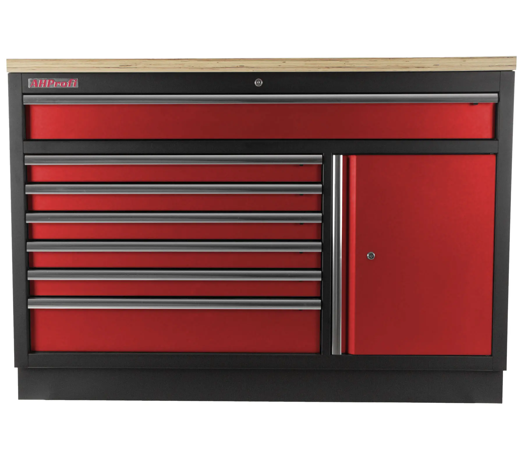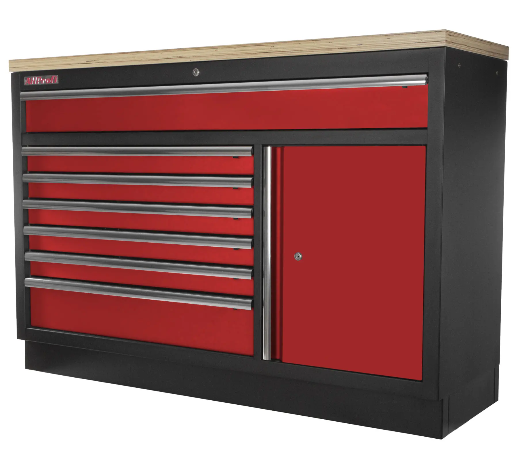 Široká celokovová dielenská skrinka so 7 zásuvkami, skrinkou a drevenou pracovnou doskou.