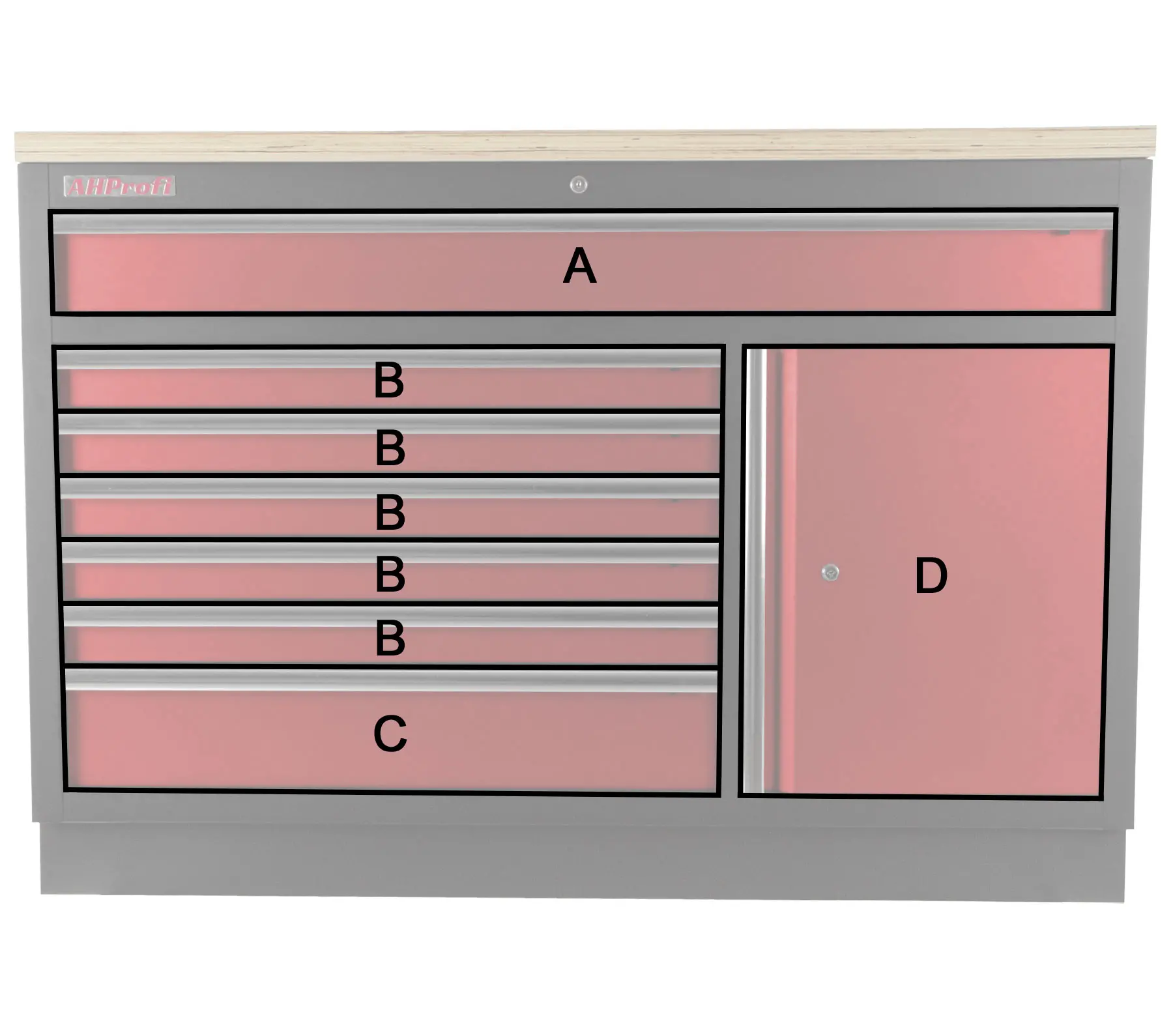 Na ľavej strane je celkom 6 zásuviek, ktoré sa hodia najmä na ručné náradie  alebo výplne s náradím, do spodnej hlbšej zásuvky je možné uskladniť aj väčšie náradie.