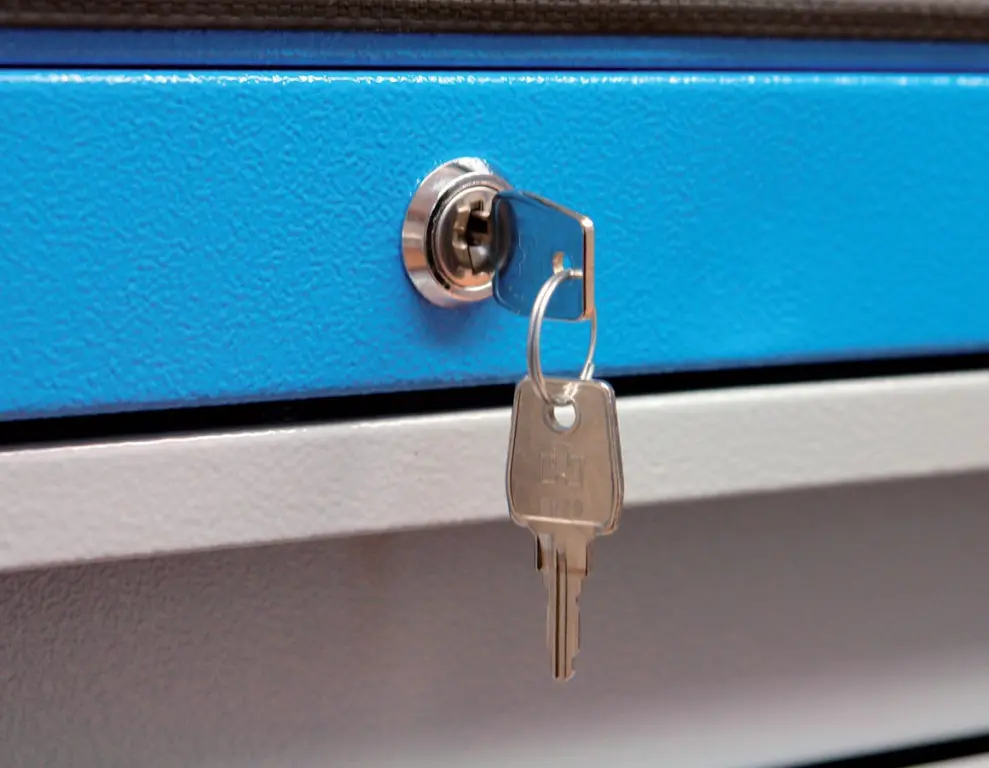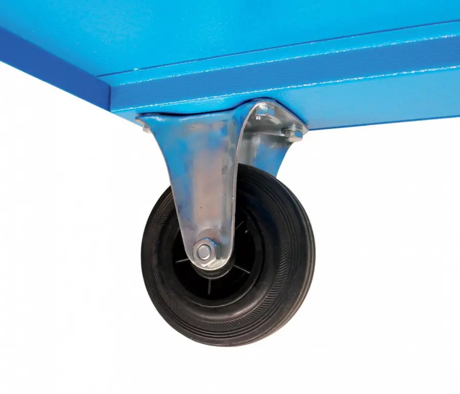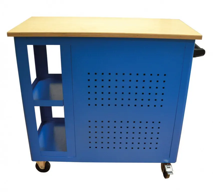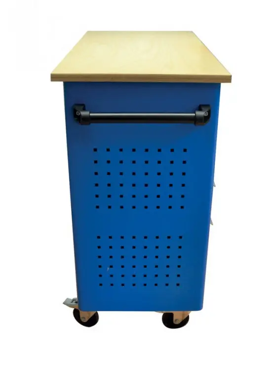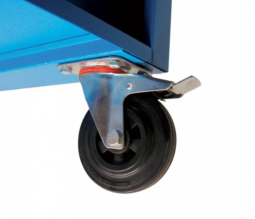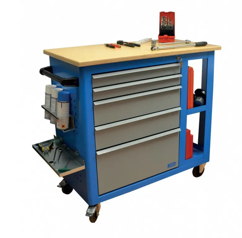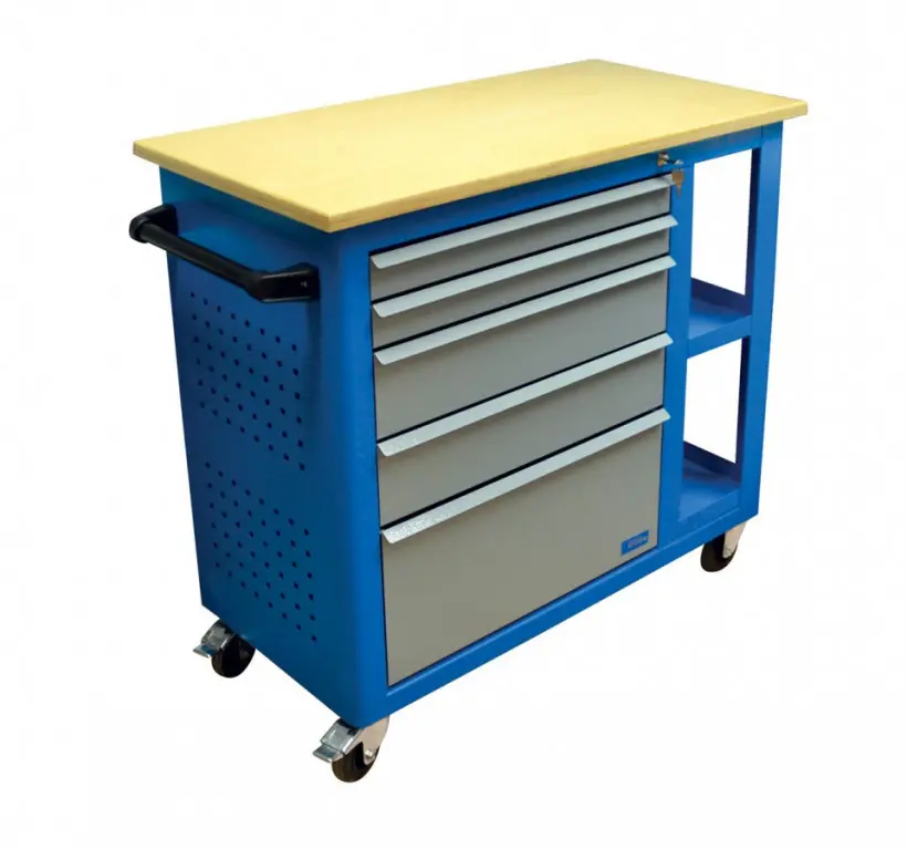 Vybavenie: 5 zásuviek (→ 2 x výška 55 mm / 2 x výška 125 mm / 1 x výška 270 mm, centrálne uzamykanie cylindrickým zámkom, 2 kľúče); dierované steny pre upevnenie závesných držiakov náradia (→ otvory 10 mm2); bočná odkladacia plocha s poličkou