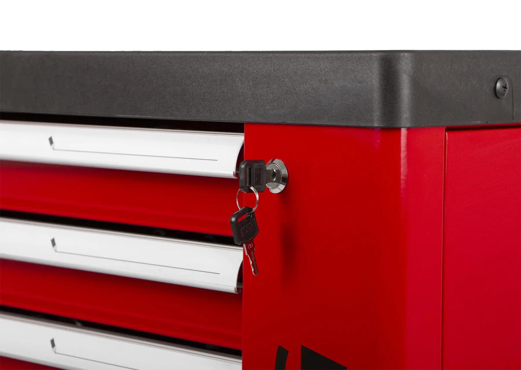 Pre zamedzenie prístupu nepovolaným osobám k náradiu, využijete zámok na prednej strane skrinky a zaistíte všetkých 7 zásuviek naraz.