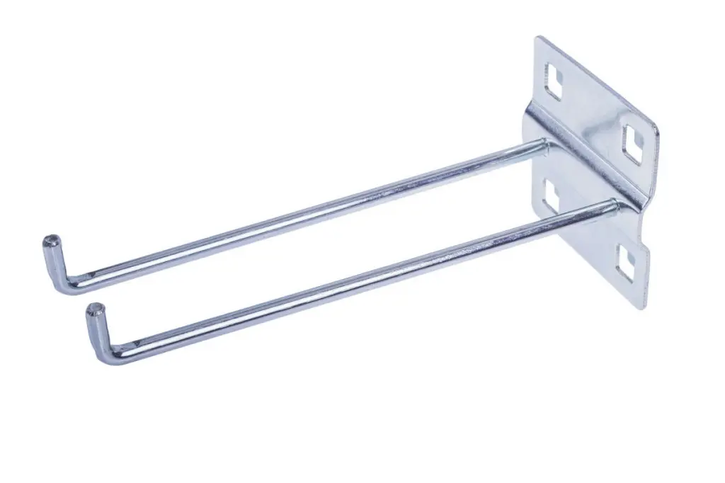 Dlhý dvojitý hák do dierovanej dosky, 150 mm, rozteč 38 x 38 mm, oceľový.