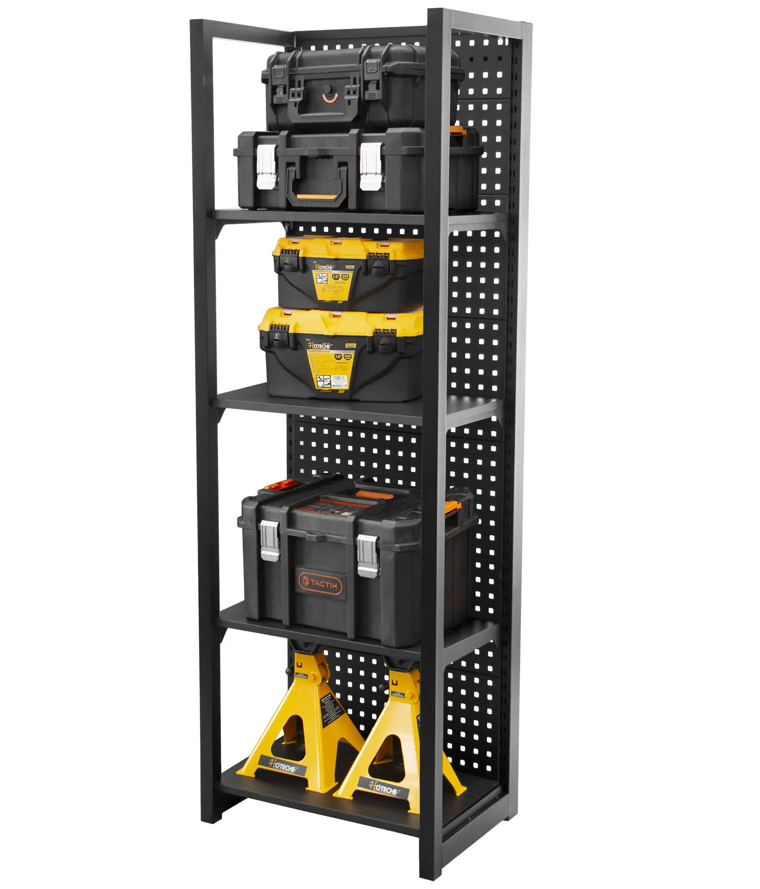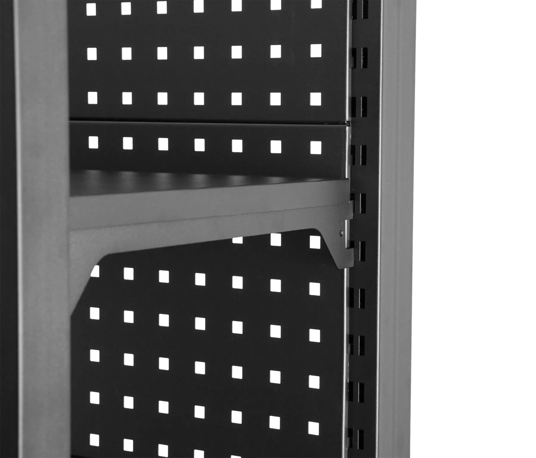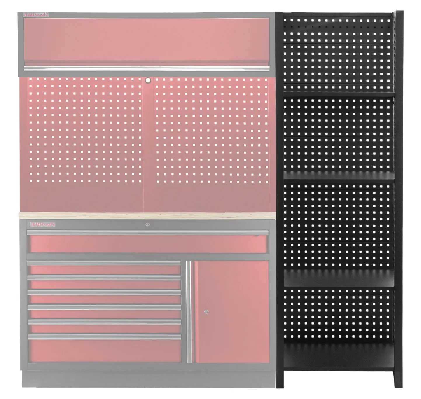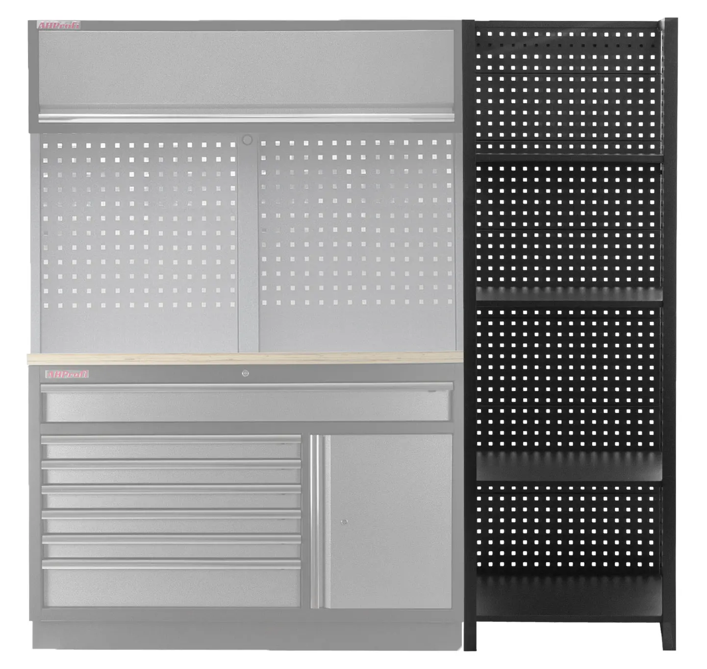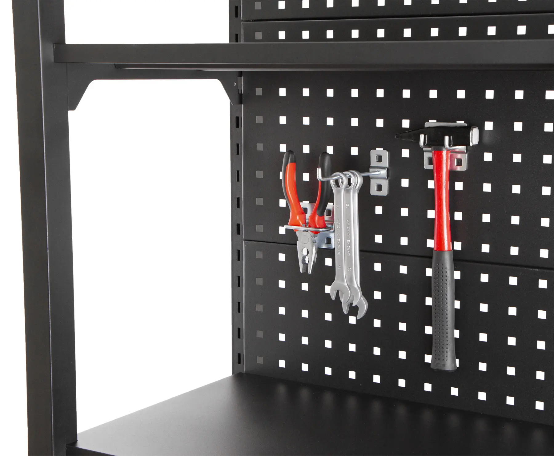 Stabilitu regálu zaisťujú dve bočnice a zadná dierovaná doska, ktorú je možné tiež využiť pre zavesenie drobného náraia pomocou háčikov (náradie a háčiky niesú súčasťou balenia).