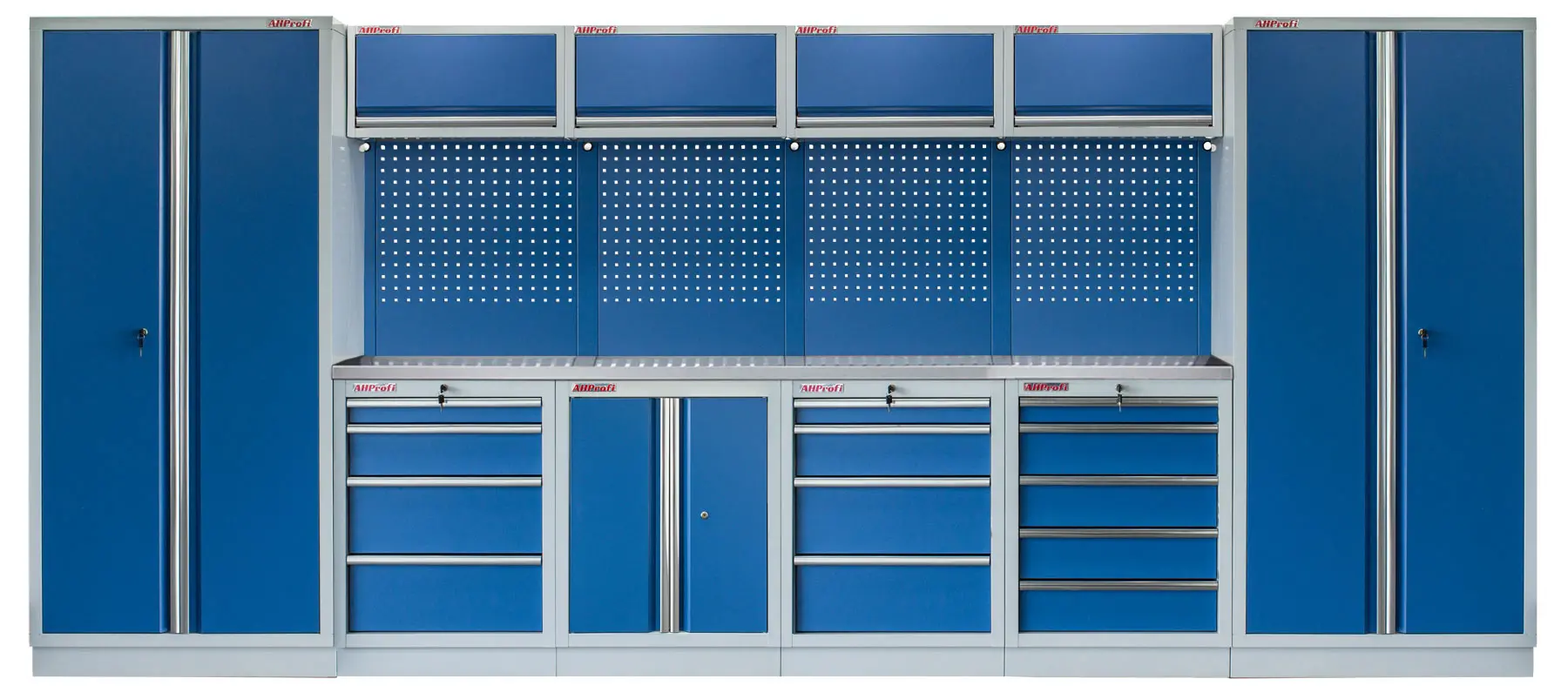 Dielenský nábytok PROFI BLUE s nerezovou doskou zaujme moderným a profesionálnym vzhľadom. Kombinácia modrej RAL 5023 a šedej RAL 7035 sa bude vynímať v každej garáži aj dielni. Zostava nábytku v sebe skrýva dostatočné množstvo úložného priestoru pre vaše náradie, autotechniku aj dielenské vybavenie. V kombinácii s robustnou pracovnou doskou získate multifunkčnú stenu, s ktorou vám práca pôjde od ruky vo všetkých smeroch. Jednotlivé komponenty sú plne konfigurovateľné, zostavu je možné podľa vašich potrieb rozšíriť o ďalšie skrine, regály aj pracovné stoly.Zostava nábytku MTGS1300A22