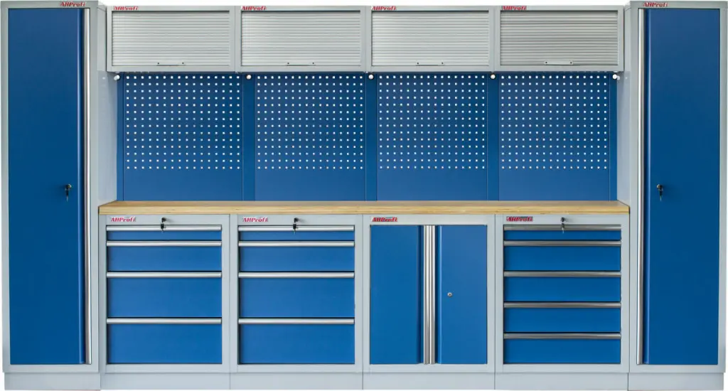 Dielenský nábytok PROFI BLUE s drevenou doskou zaujme moderným a profesionálnym vzhľadom. Kombinácia modrej RAL 5023 a šedej RAL 7035 sa bude vynímať v každej garáži aj dielni. Zostava nábytku v sebe skrýva dostatočné množstvo úložného priestoru pre vaše náradie, autotechniku aj dielenské vybavenie. V kombinácii s robustnou pracovnou doskou získate multifunkčnú stenu, s ktorou vám práca pôjde od ruky vo všetkých smeroch. Jednotlivé komponenty sú plne konfigurovateľné, zostavu je možné podľa vašich potrieb rozšíriť o ďalšie skrine, regály aj pracovné stoly.Zostava nábytku MTGS1300A9