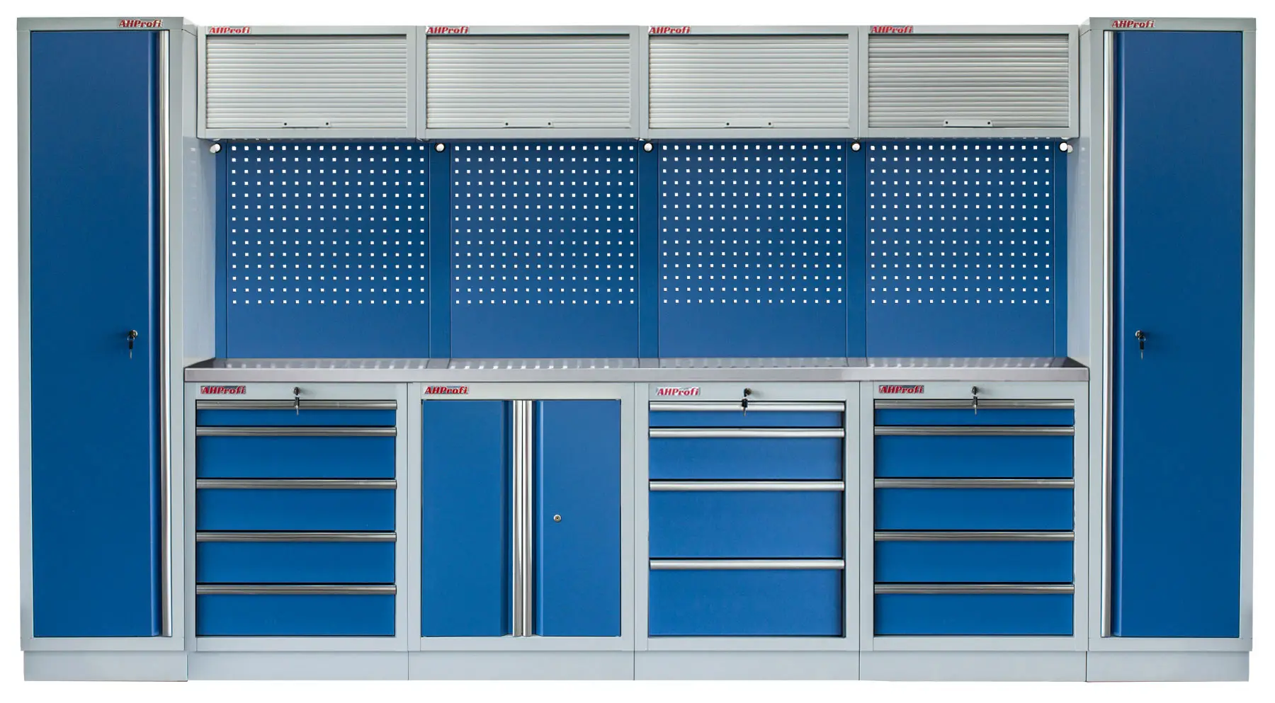 Dielenský nábytok PROFI BLUE s nerezovou doskou zaujme moderným a profesionálnym vzhľadom. Kombinácia modrej RAL 5023 a šedej RAL 7035 sa bude vynímať v každej garáži aj dielni. Zostava nábytku v sebe skrýva dostatočné množstvo úložného priestoru pre vaše náradie, autotechniku aj dielenské vybavenie. V kombinácii s robustnou pracovnou doskou získate multifunkčnú stenu, s ktorou vám práca pôjde od ruky vo všetkých smeroch. Jednotlivé komponenty sú plne konfigurovateľné, zostavu je možné podľa vašich potrieb rozšíriť o ďalšie skrine, regály aj pracovné stoly.Zostava nábytku MTGS1300AW