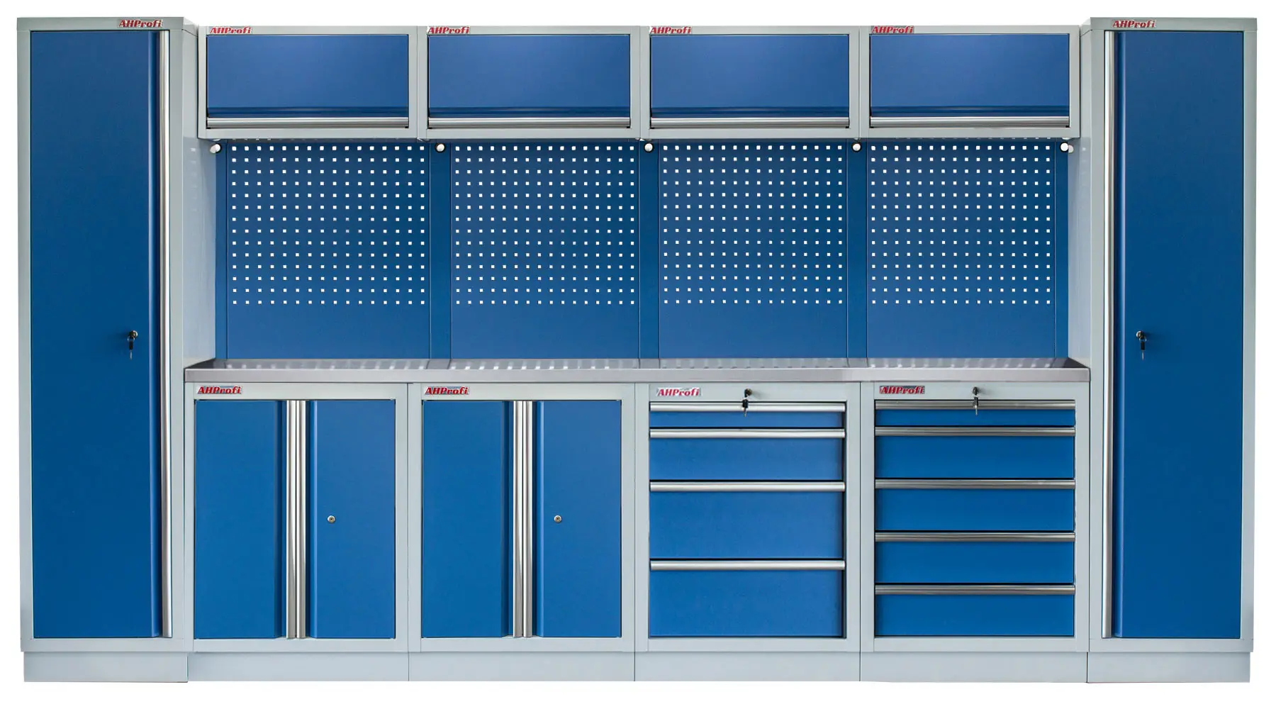 Zostava 21 ks dielenského nábytku PROFI BLUE s nerezovou pracovnou doskou