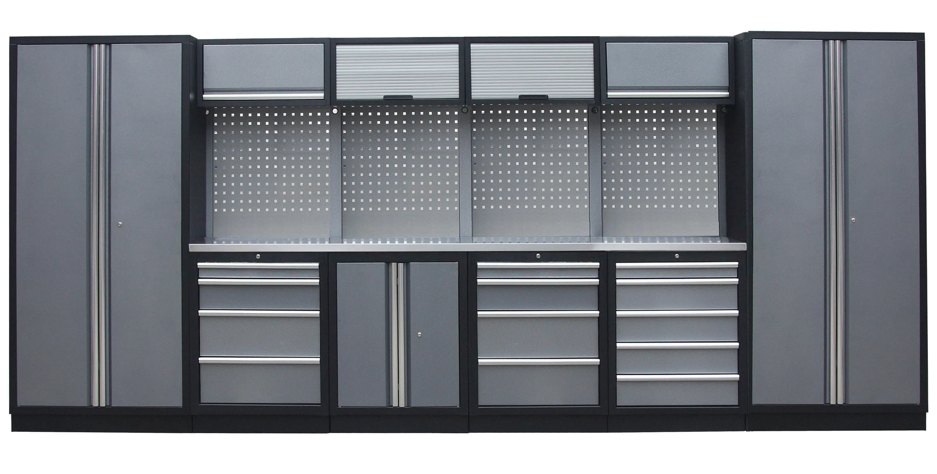 Zostava 21 ks dielenského nábytku PROFI GREY s nerezovou pracovnou doskou