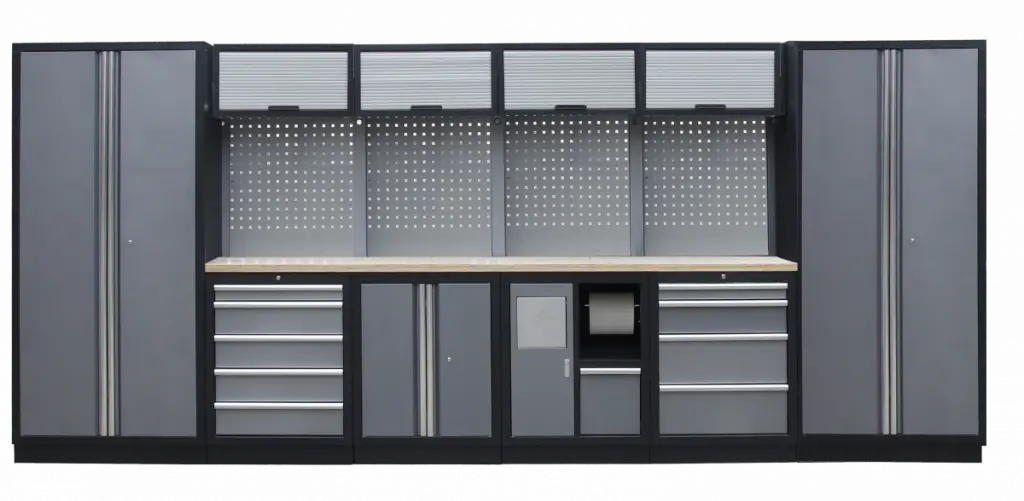 Zostava 21 ks dielenského nábytku PROFI GREY s drevenou pracovnou doskou