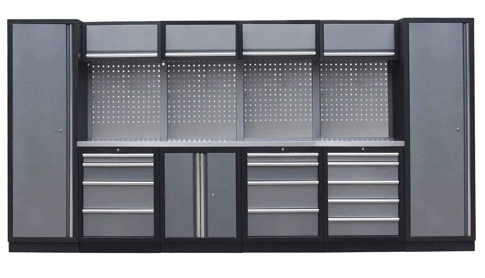 Zostava nábytku v sebe skrýva dostatočné množstvo úložného priestoru pre vaše náradie, autotechniku aj dielenské vybavenie. V kombinácii s robustnou pracovnou doskou získate multifunkčnú stenu, s ktorou vám pôjde práca od ruky vo všetkých smeroch.