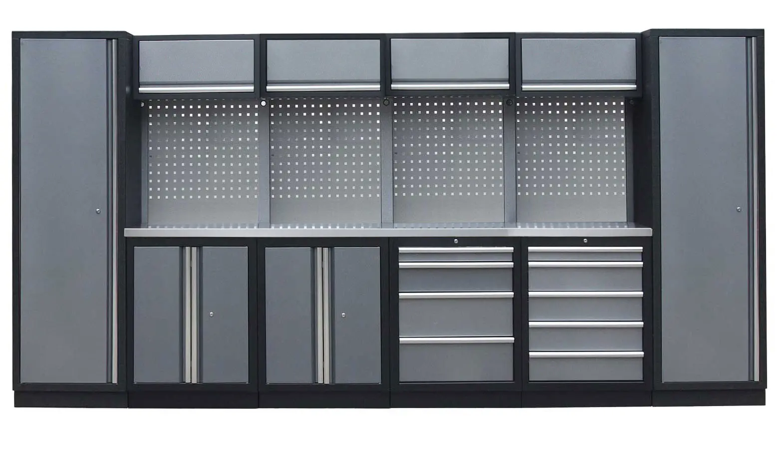 Zostava nábytku v sebe skrýva dostatočné množstvo úložného priestoru pre vaše náradie, autotechniku aj dielenské vybavenie. V kombinácii s robustnou pracovnou doskou získate multifunkčnú stenu, s ktorou vám pôjde práca od ruky vo všetkých smeroch.