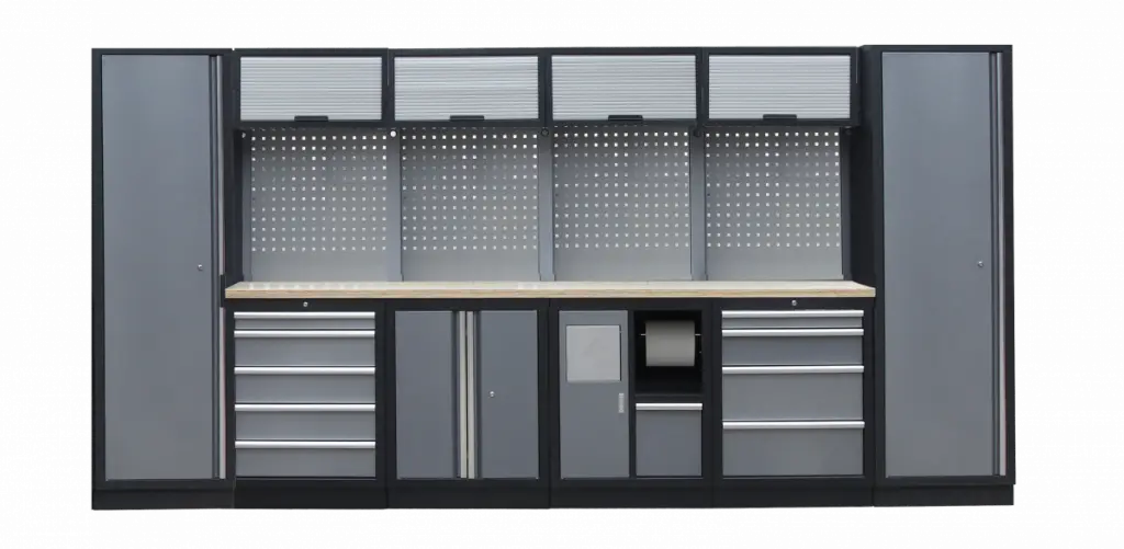 Zostava nábytku v sebe skrýva dostatočné množstvo úložného priestoru pre vaše náradie, autotechniku aj dielenské vybavenie. V kombinácii s robustnou pracovnou doskou získate multifunkčnú stenu, s ktorou vám pôjde práca od ruky vo všetkých smeroch.