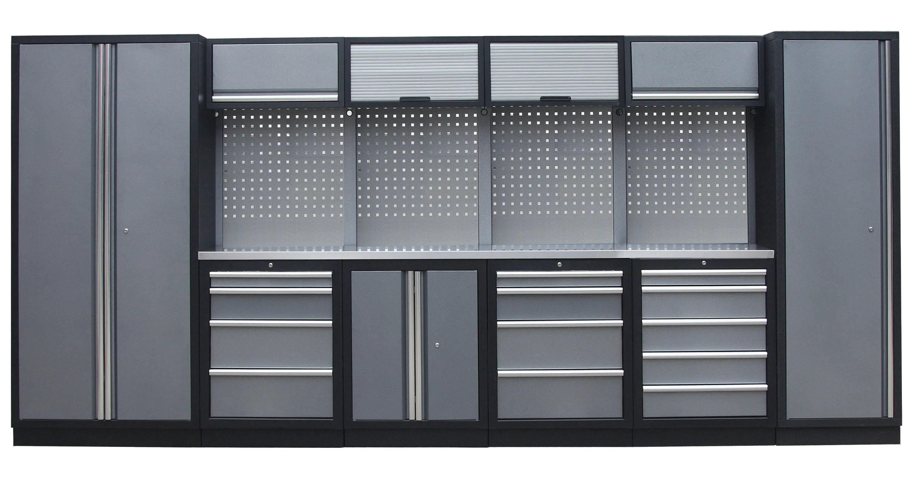 Dielenský nábytok PROFI GREY s nerezovou doskou zaujme moderným a profesionálnym vzhľadom. Kombinácia kladívkovo sivej RAL 3031 a čiernej RAL 9004 sa bude vynímať v každej garáži aj dielni. Zostava nábytku v sebe skrýva dostatočné množstvo úložného priestoru pre vaše náradie, autotechniku aj dielenské vybavenie. V kombinácii s robustnou pracovnou doskou získate multifunkčnú stenu, s ktorou vám pôjde práca od ruky vo všetkých smeroch. Jednotlivé komponenty sú plne konfigurovateľné, zostavu je možné podľa vašich potrieb rozšíriť o ďalšie skrine, regály aj ponk.Zostava nábytku TGS1300A44