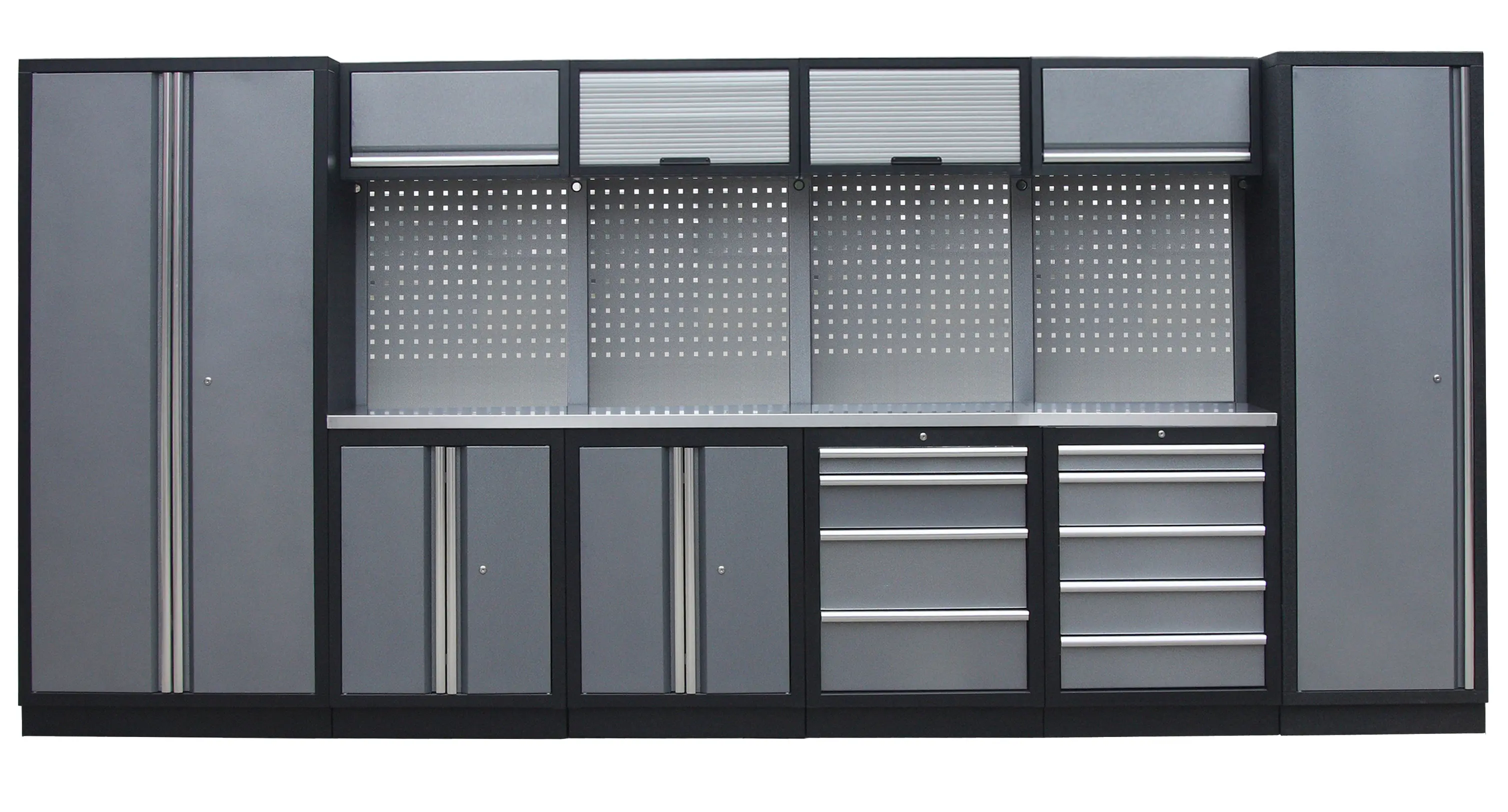 Dielenský nábytok PROFI GREY s nerezovou doskou zaujme moderným a profesionálnym vzhľadom. Kombinácia kladívkovo sivej RAL 3031 a čiernej RAL 9004 sa bude vynímať v každej garáži aj dielni. Zostava nábytku v sebe skrýva dostatočné množstvo úložného priestoru pre vaše náradie, autotechniku aj dielenské vybavenie. V kombinácii s robustnou pracovnou doskou získate multifunkčnú stenu, s ktorou vám pôjde práca od ruky vo všetkých smeroch. Jednotlivé komponenty sú plne konfigurovateľné, zostavu je možné podľa vašich potrieb rozšíriť o ďalšie skrine, regály aj ponk.Zostava nábytku TGS1300BB4