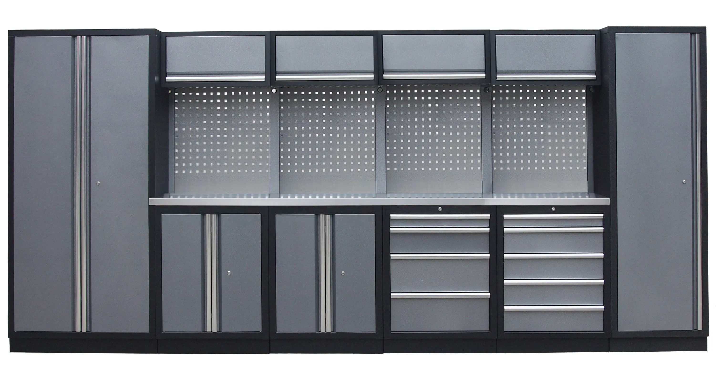 Dielenský nábytok PROFI GREY s nerezovou doskou zaujme moderným a profesionálnym vzhľadom. Kombinácia kladívkovo sivej RAL 3031 a čiernej RAL 9004 sa bude vynímať v každej garáži aj dielni. Zostava nábytku v sebe skrýva dostatočné množstvo úložného priestoru pre vaše náradie, autotechniku aj dielenské vybavenie. V kombinácii s robustnou pracovnou doskou získate multifunkčnú stenu, s ktorou vám pôjde práca od ruky vo všetkých smeroch. Jednotlivé komponenty sú plne konfigurovateľné, zostavu je možné podľa vašich potrieb rozšíriť o ďalšie skrine, regály aj ponk.Zostava nábytku TGS1300BB5