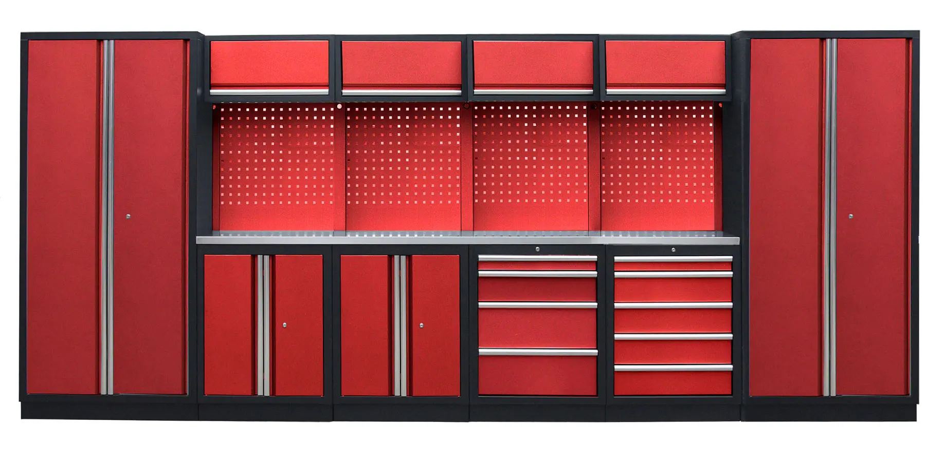 Zostava 21 ks, 4535 x 495 x 2000 mm, nerezová pracovná doska, modulárna, celokovová, červená. Hor...