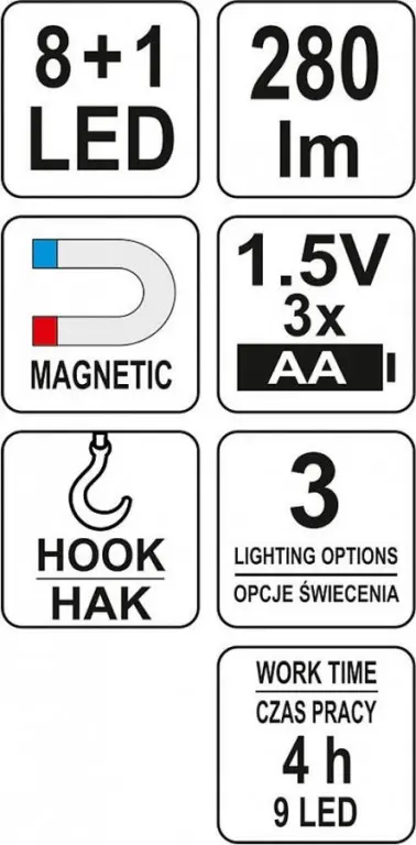 Svetelný tok dosahuje hodnoty 280 lm. Lampa je vybavená silnými magnetmi zo zadnej strany a výsuvným háčikom. Lampa tak môže stáť na rovnej podložke, alebo ju možno vďaka uvedeným prvkom prichytiť na kovovú konštrukciu, či zavesiť na háčik.