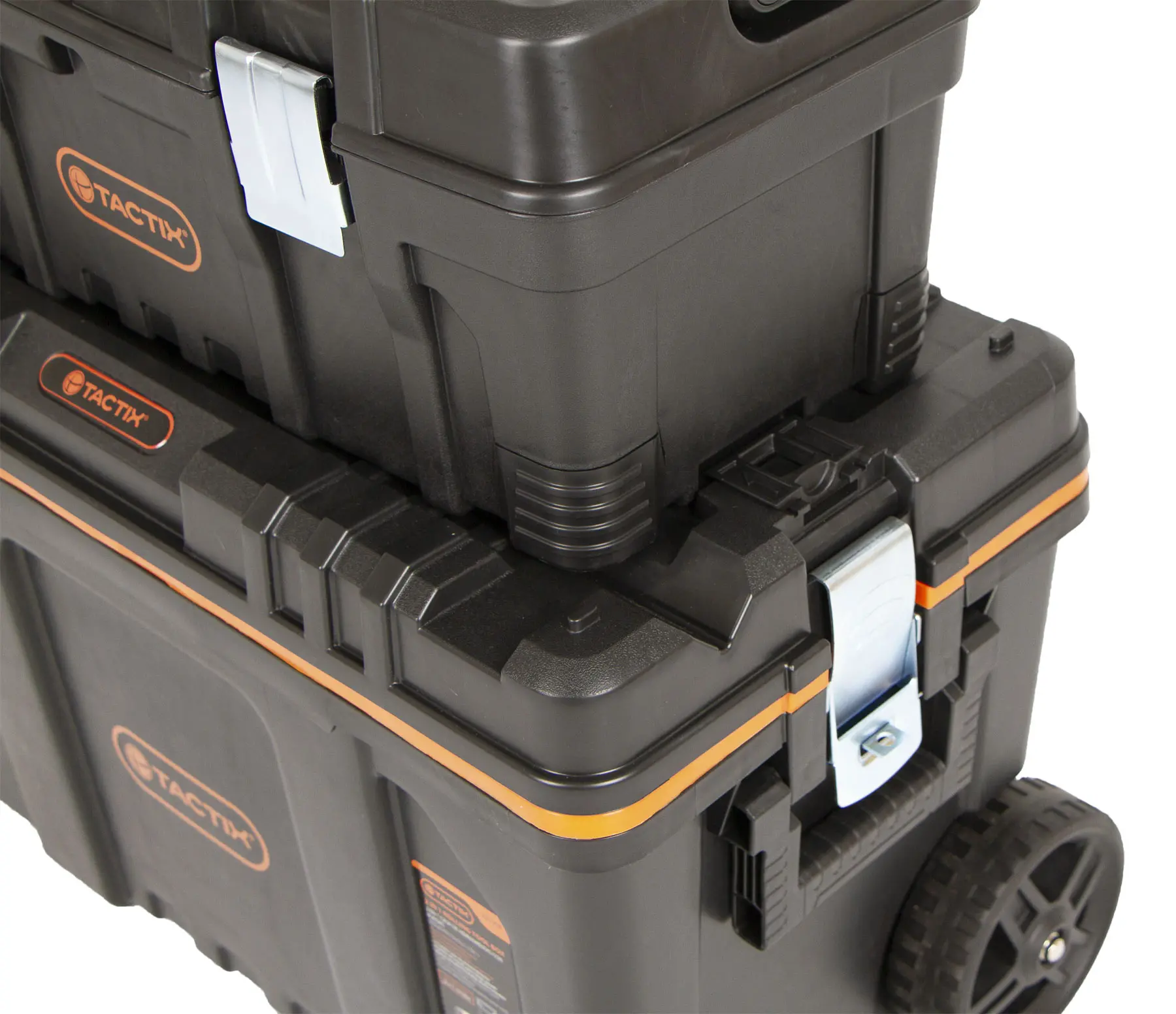 Spodný box je zaopatrený teleskopickým madlom (90 cm) a kolieskami, vo vnútri ktorého sa nachádza odnímateľné plato na drobnejší materiál a veľký úložný priestor.