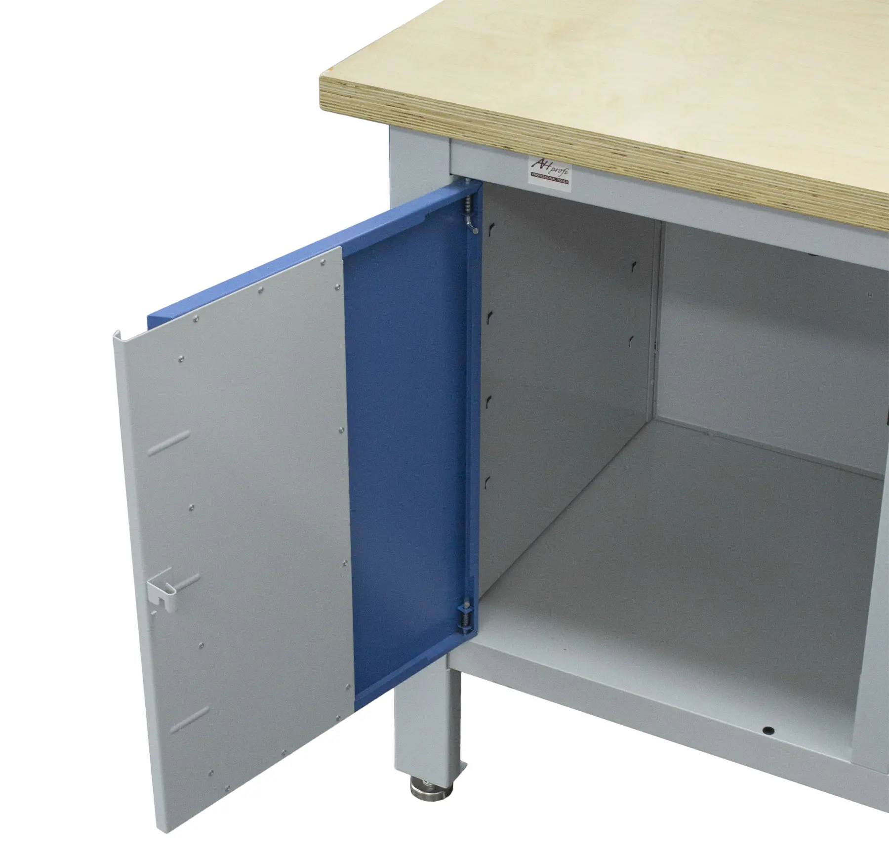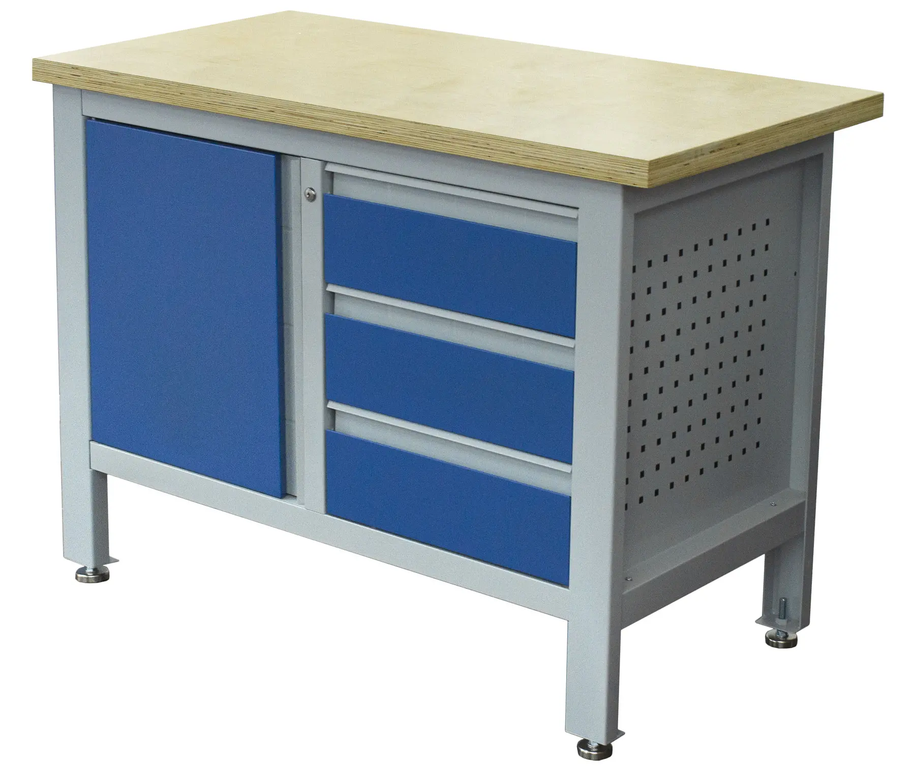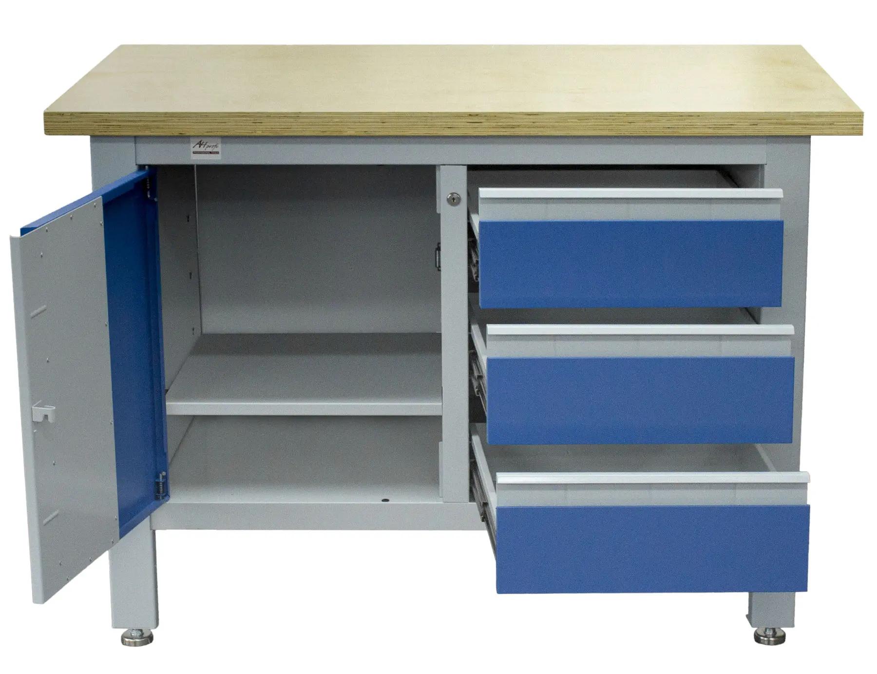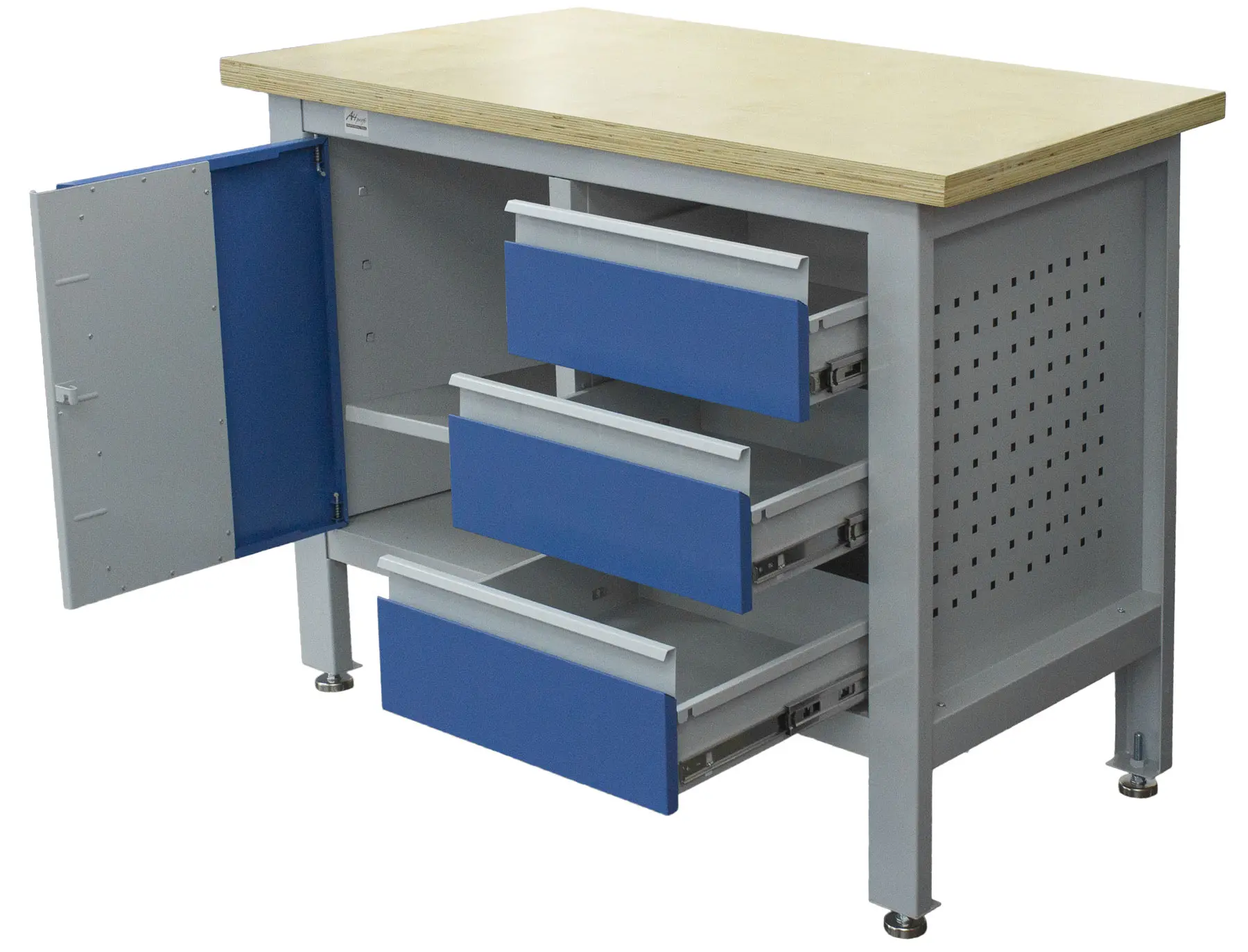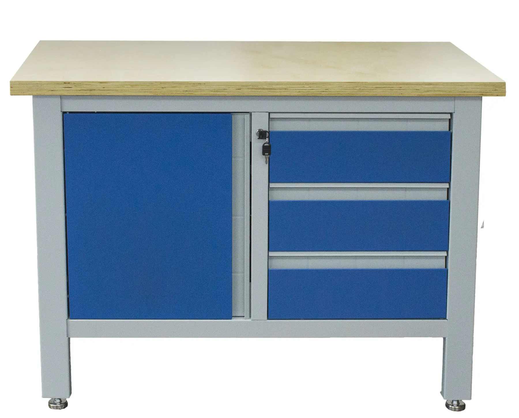 Profesionálny kovový pracovný stôl s tromi zásuvkami a skrinkou, pracovnou doskou z masívneho dre...