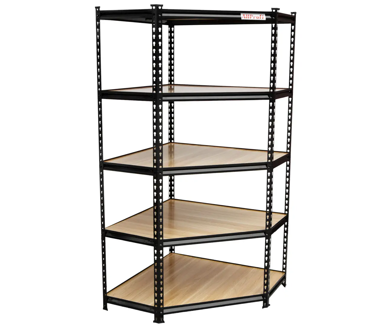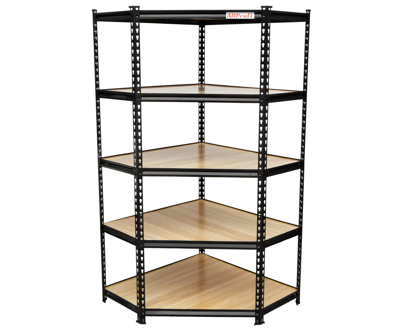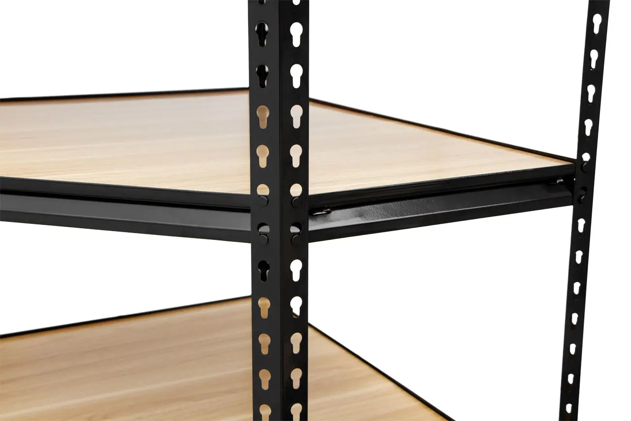 Rohový policový regál je konštruovaný z kvalitnej ocele pre maximálnu odolnosť a stabilitu. Konštrukcia z 0,8 mm ocele má oproti bežným regálom z 0,6 mm ocele vysokú nosnosť až 265 kg na policu. Police sú výškovo nastaviteľné a vyrobené z pevných MDF dosiek s hladkým povrchom. Súčasťou regálu je 5 políc.