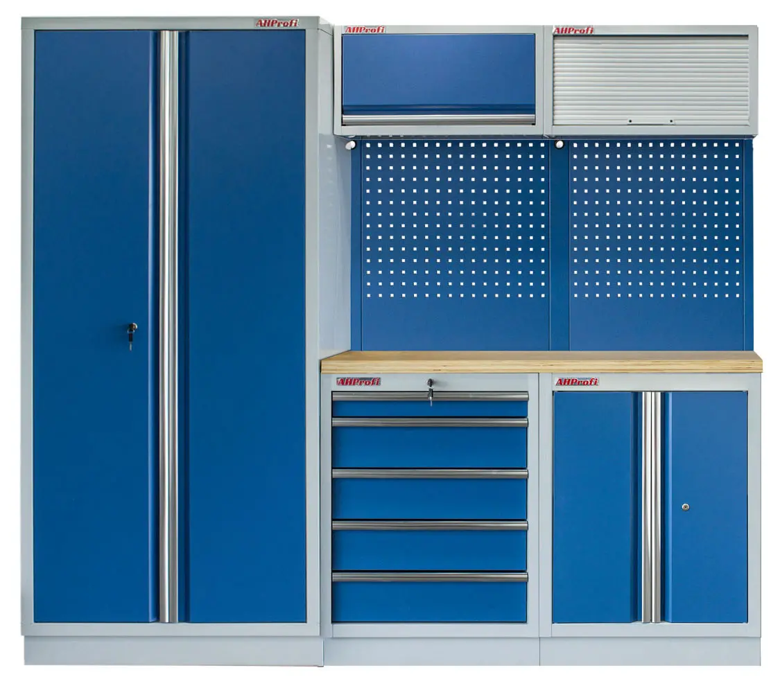 Dielenský nábytok PROFI BLUE s drevenou doskou zaujme moderným a profesionálnym vzhľadom. Kombinácia modrej RAL 5023 a šedej RAL 7035 sa bude vynímať v každej garáži aj dielni. Zostava nábytku v sebe skrýva dostatočné množstvo úložného priestoru pre vaše náradie, autotechniku aj dielenské vybavenie. V kombinácii s robustnou pracovnou doskou získate multifunkčnú stenu, s ktorou vám práca pôjde od ruky vo všetkých smeroch. Jednotlivé komponenty sú plne konfigurovateľné, zostavu je možné podľa vašich potrieb rozšíriť o ďalšie skrine, regály aj pracovné stoly.Zostava nábytku MTGS1301BAL01