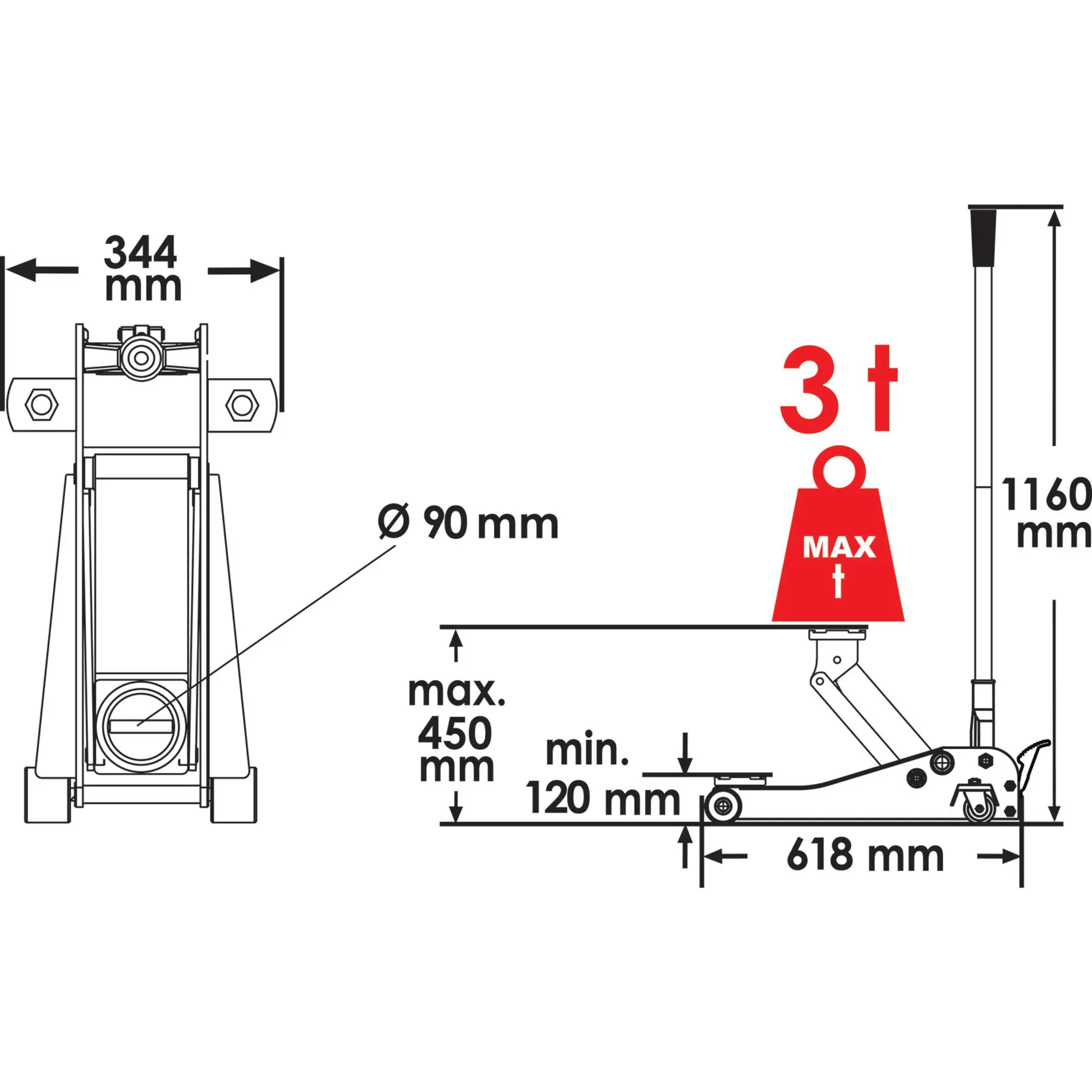 Tento hever má rozsah zdvihu od 120 mm do 450 mm a nosnosť 3 tony.