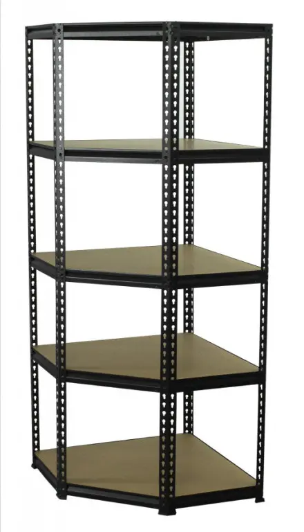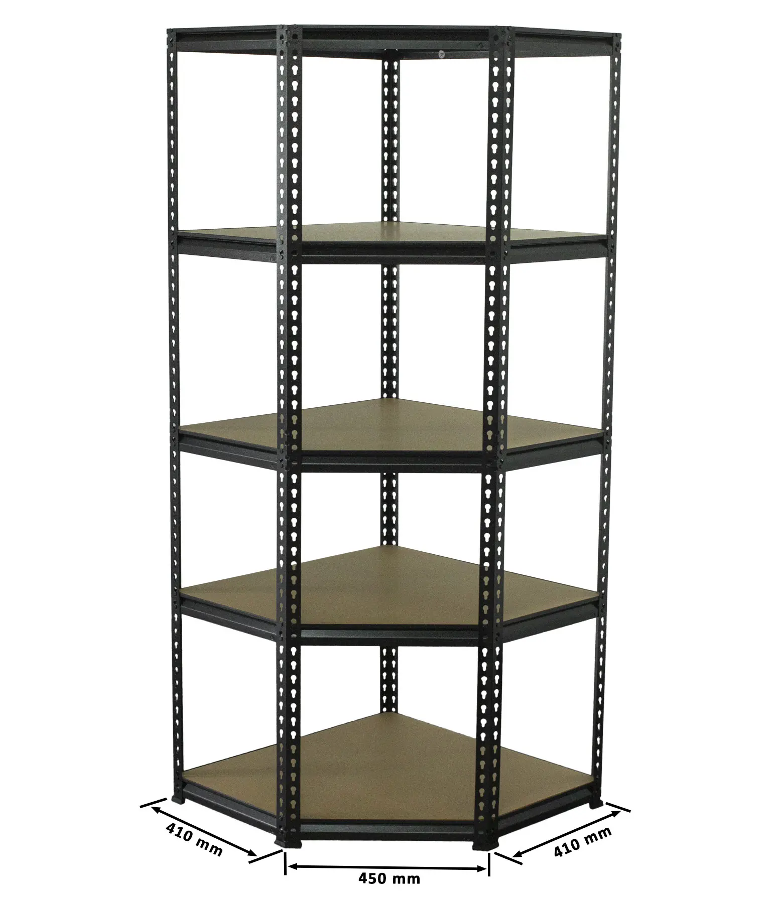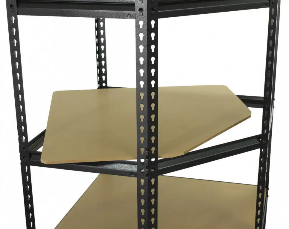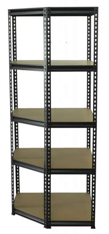 Rohový policový regál o rozmeroch 1830 x 730 x 730 mm s nosnosťou 150 kg. 5 políc.